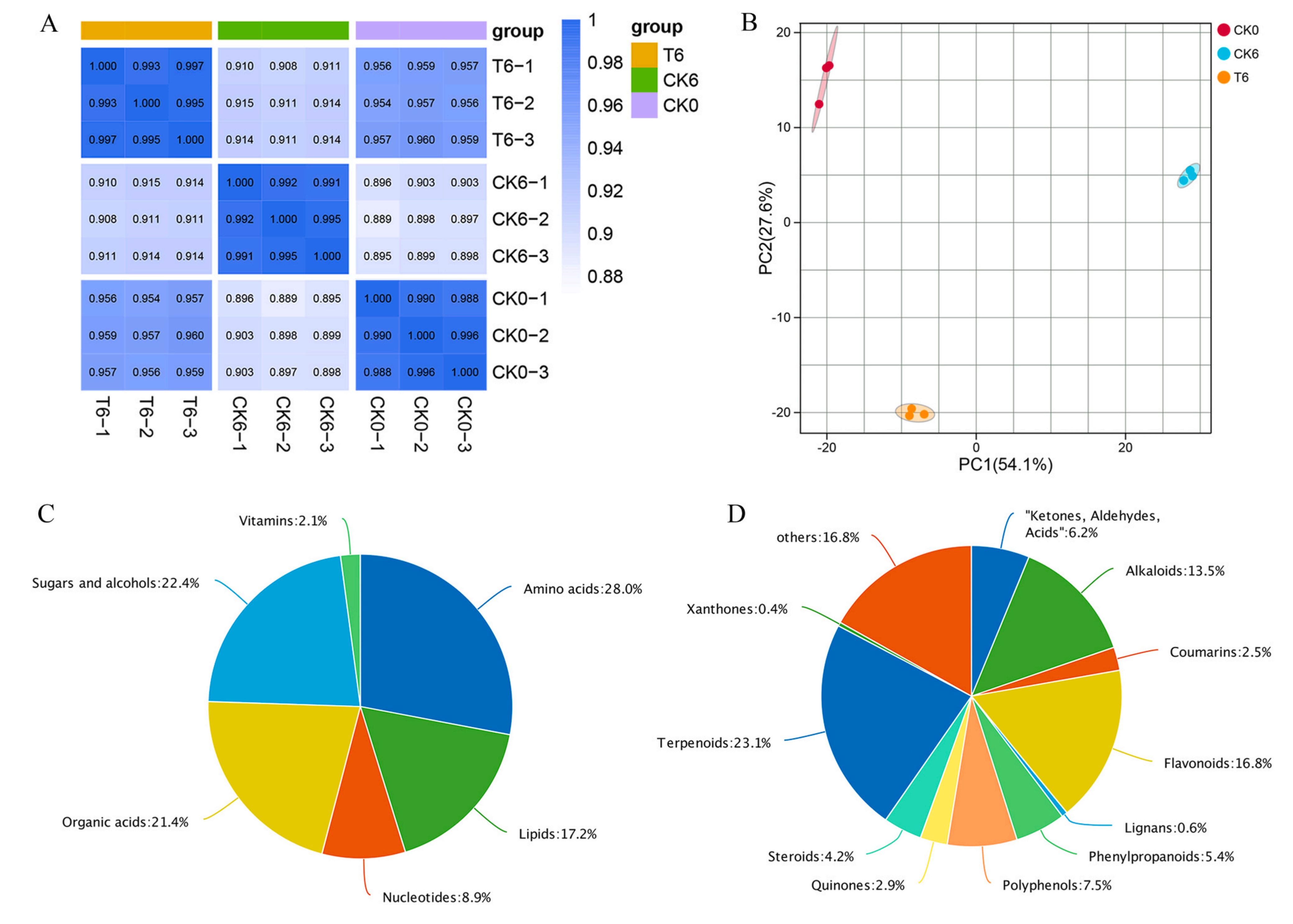 為了進一步研究H2S對黃花菜貯藏過程中品質(zhì)的調(diào)控機制,利用植物廣靶代謝組學方法分析了NaHS處理后黃花菜代謝產(chǎn)物的變化。共鑒定了910種代謝物,包括429種初級代謝物和481種次生代謝物,分別為氨基酸、糖和醇、有機酸、脂質(zhì)、核苷酸、維生素、萜類、黃酮類、生物堿、多酚、“酮類、醛類、酸類”、苯丙素、類固醇、醌類、香豆素、木脂素和山酮。PCA分析顯示,CK0, CK6和T6三組在代謝水平上存在差異。
