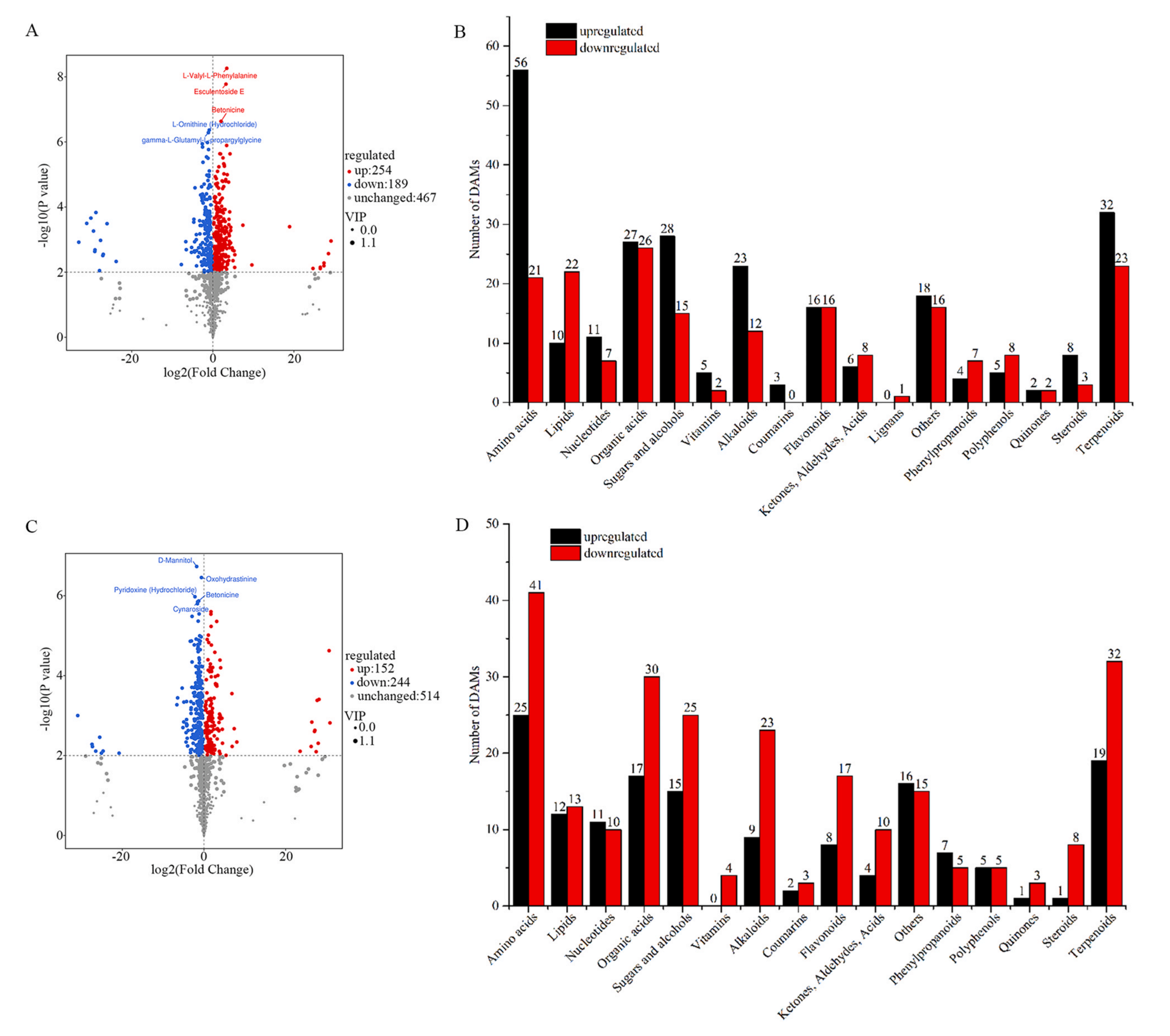 根據(jù)FC > 1、P < 0.05和VIP > 1的篩選標準,在CK0和CK6之間共鑒定出443個DAMs。其中,254種代謝物在CK0中上調(diào),189種代謝物下調(diào)。這些DAMs代表了衰老黃花菜的主要成分變化,可分為17類,包括230種初級代謝物和213種次級代謝物。包括56種氨基酸、10種脂類、11種核苷酸、27種有機酸、28種糖和醇類、5種維生素、23種生物堿、3種香豆素、16種黃酮類、6種酮類、醛類、酸類、4種苯丙素、5種多酚類、2種醌類、8種類固醇、32種萜類和18個其他類。對于下調(diào)代謝物,鑒定了93種氨基酸(21種)、脂質(zhì)(22種)、核苷酸(7種)、有機酸(26種)、糖和醇(15種)、維生素(2種)的初級代謝物,以及96種生物堿(12種)、類黃酮(16種)、酮類、醛類、酸類(8種)、木脂素(1種)、苯丙素(7種)、多酚類(8種)、醌類(2種)、類固醇(3種)、萜類(23種)和其他(16種)的次級代謝物。KEGG富集分析表明,DAMs與氨基酰基- tRNA生物合成、乙醛酸鹽和二羧酸鹽代謝、精氨酸生物合成、D -氨基酸代謝、丙氨酸、天冬氨酸和谷氨酸代謝密切相關(guān)。