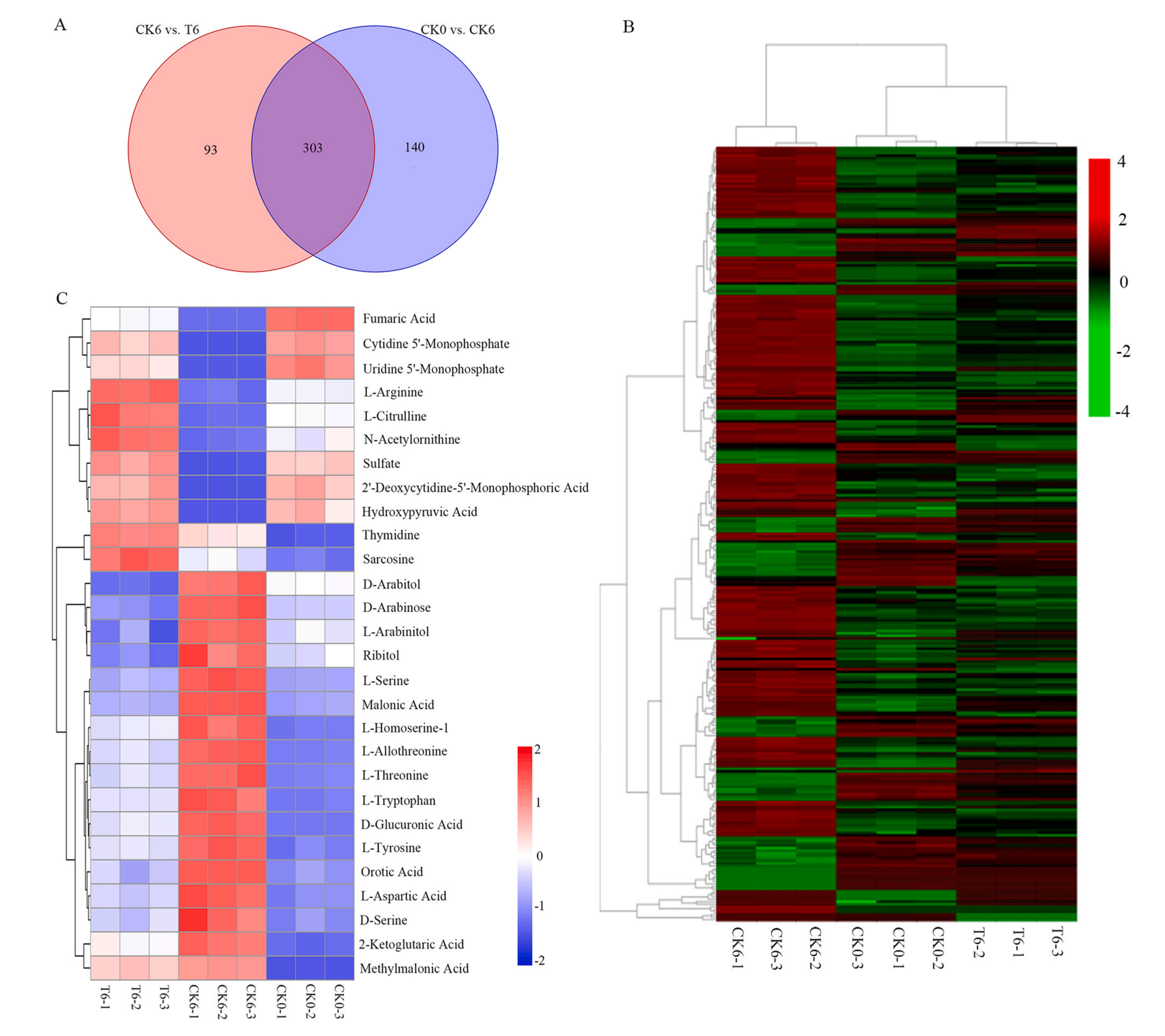 CK6和T6積累的差異代謝物表明H2S處理具有顯著影響。在396個顯著改變的DAMs中,152個上調(diào),244個下調(diào)。氨基酸(66),有機酸(47),糖和醇(40),脂質(zhì)(25),核苷酸(21)和維生素(4),萜類(51),生物堿(32),類黃酮(25),酮類,醛類,酸類(14),苯丙素(12),多酚(10),類固醇(9),香豆素(5),醌類(4),其他類(31)。這些DAMs主要與甘油磷脂代謝、嘧啶代謝、戊糖、甘氨酸、絲氨酸和蘇氨酸代謝有關(guān)。