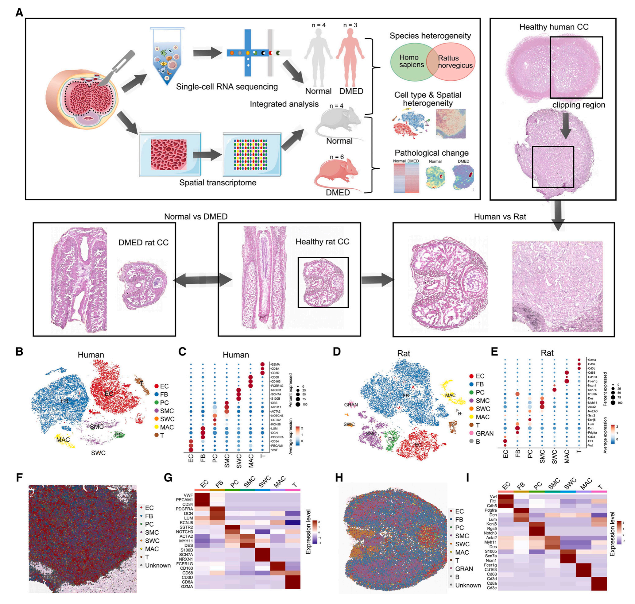 圖1-通過scRNA-seq和空間轉(zhuǎn)錄組技術(shù)得到的人類,以及正常/DMED條件下大鼠的CC細胞全局表達譜