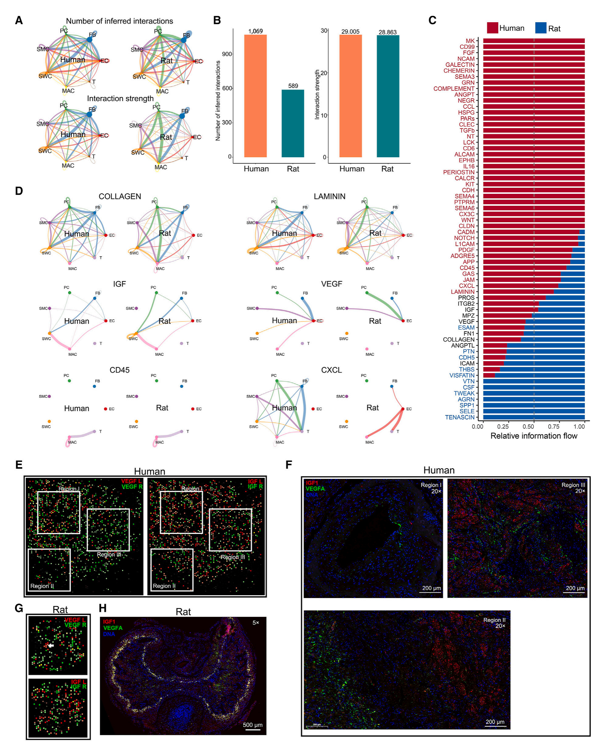 為了研究、比較人類和大鼠間CC微環(huán)境的復雜信號網(wǎng)絡,研究者使用scRNA-seq數(shù)據(jù)進行CellChat分析,發(fā)現(xiàn)大鼠CC中的細胞互作數(shù)量雖然小于人類,但細胞互作強度是相似的。基于這些互作的表達模式,研究者進行簡單的分類,發(fā)現(xiàn)雖然胞外基質(zhì)相關的互作整體強度與細胞類型間配體-受體強度相當,但兩者基因組成是有差異的;血管生成相關的互作整體強度在人類和大鼠中沒有差異,但基因組成存在差異,如大鼠CC微環(huán)境中是主要是VEGFB表達,而人類CC微環(huán)境中高表達的是VEGFA和IGF1。