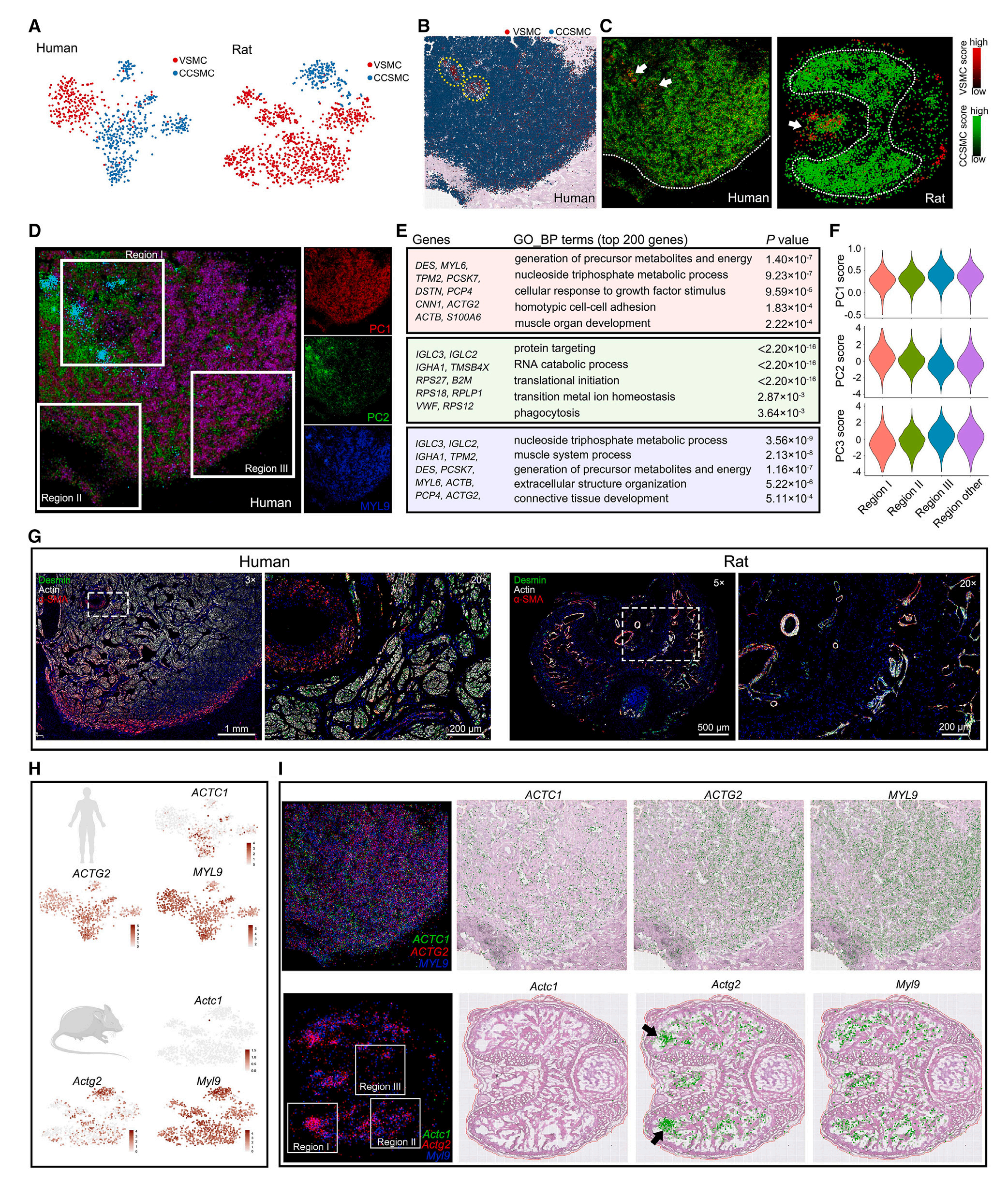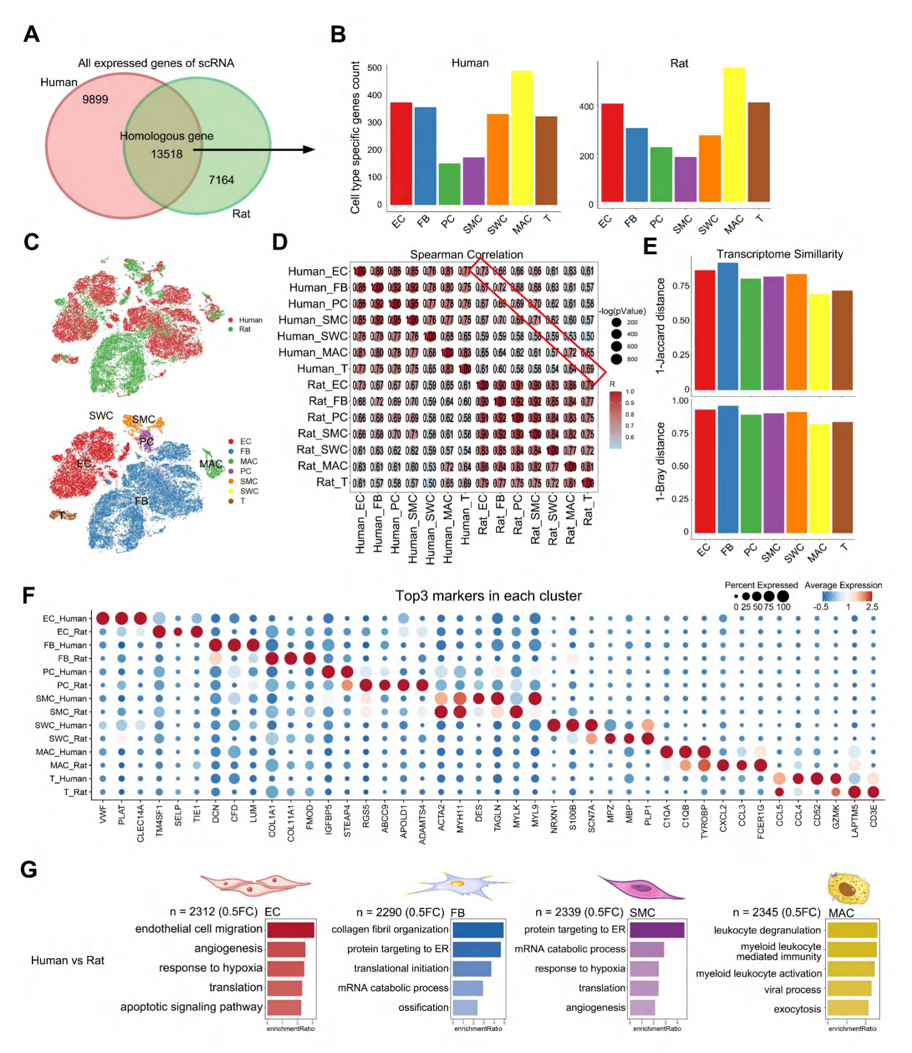 通過分析空間轉(zhuǎn)錄組數(shù)據(jù)中的人—鼠同源基因,研究者找到人類和大鼠共有的459個top SVG,大多數(shù)SVG并不是細胞類型特異的,其中EC、FB和SMC是表達這些SVG最多的3種類型細胞。富集分析結(jié)果顯示,基礎生物學過程如“translational initiation”、“extracellular structure organization”以及“protein targeting”,在人類和大鼠CC組織的空間轉(zhuǎn)錄組數(shù)據(jù)中是保守的;人類特異SVG主要與炎癥響應有關,而這些SVG的大鼠同源基因主要與代謝過程有關。
