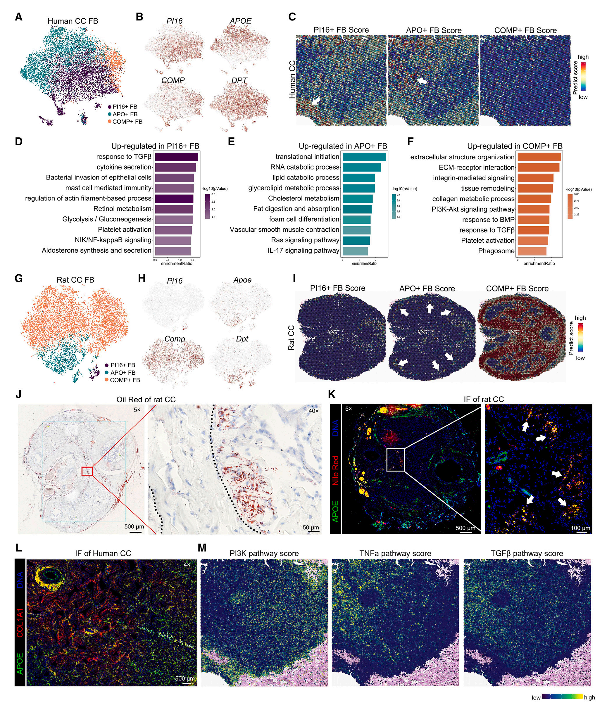 近期,CC的FB(成纖維細胞)成為研究熱點,但對其空間和物種異質(zhì)性仍不清楚。研究者根據(jù)PI16、APOE及其他載脂蛋白、COMP的表達情況,將人類CC FB分成3種亞群??臻g轉(zhuǎn)錄組數(shù)據(jù)分析結(jié)果顯示,人類CC中3種FB亞群空間分布模式不同,富集的功能也不同;大鼠CC FB表現(xiàn)出與人類CC FB相似的亞群和標志基因,但每種亞群的比例與人類顯著不同。