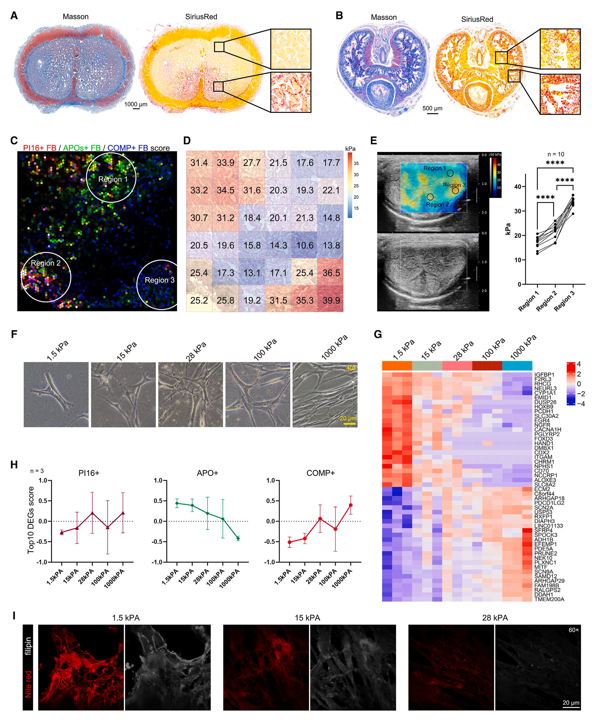 本研究中,研究者發(fā)現(xiàn)COMP+ FB生態(tài)位顯著富集了“integrin-mediated signaling pathway”和“response to mechanical stimulus”term;人和大鼠CC中ECM/細胞組成比例表現(xiàn)出明顯的空間異質(zhì)性;空間轉(zhuǎn)錄組數(shù)據(jù)和免疫熒光染色結(jié)果類似,靠近陰莖背神經(jīng)血管束的上極區(qū)域顯示出較低的纖維化水平,而遠離背神經(jīng)血管束的顯示出較高的纖維化水平;空間轉(zhuǎn)錄組數(shù)據(jù)和超聲彈性成像結(jié)果都表明,APO+ FB與更柔軟的組織硬度有關,而COMP+ FB與更硬的組織有關;不同胞外基質(zhì)硬度培養(yǎng)下的CC FB形態(tài)不同,bulk RNA-seq數(shù)據(jù)顯示機械應激顯著改變了FB的轉(zhuǎn)錄狀態(tài),一些參與調(diào)控脂質(zhì)代謝的基因與低機械力信號有關;scRNA-seq數(shù)據(jù)分析結(jié)果顯示APO+ FB分值隨組織硬度增加而降低,COMP+ FB分值隨組織硬度增加而增加;染色結(jié)果顯示隨著組織硬度增加,F(xiàn)B中的中性脂質(zhì)和膽固醇累積降低。