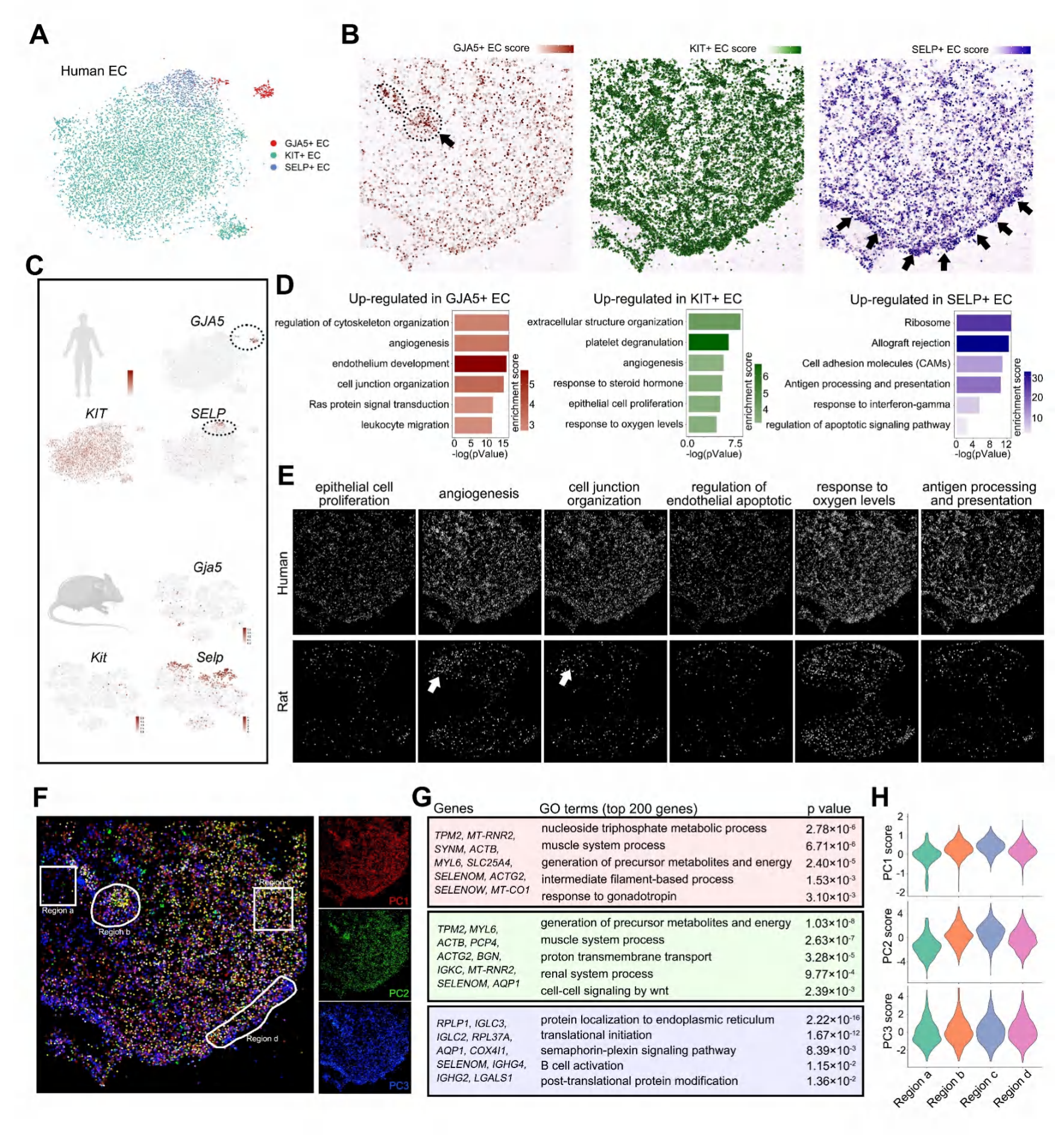根據(jù)以往的解剖觀察以及scRNA-seq數(shù)據(jù)分析,可知CC中包含3種類型EC(內(nèi)皮細胞),包括GJA5+ EC(動脈內(nèi)皮細胞)、SELP+ EC(靜脈內(nèi)皮細胞)以及KIT+ EC(海綿體竇內(nèi)皮細胞)。人類CC中GJA5+ EC占比最低,主要分布在海綿體動脈區(qū)域;SELP+ EC主要分布在白膜區(qū)域;KIT+ EC廣泛分布。但大鼠CC中,Selp+ EC比例更高,Gja5和Kit可能并不是有用的靜脈和CC內(nèi)皮細胞標志物?;趕cRNA-seq數(shù)據(jù)進行GO分析,研究者發(fā)現(xiàn)不同類型EC富集了不同功能,多數(shù)細胞類型特異性的term(條目)在人類CC中并沒有空間分布異質(zhì)性,但一些特殊term在大鼠CC中表現(xiàn)出空間分布異質(zhì)性。