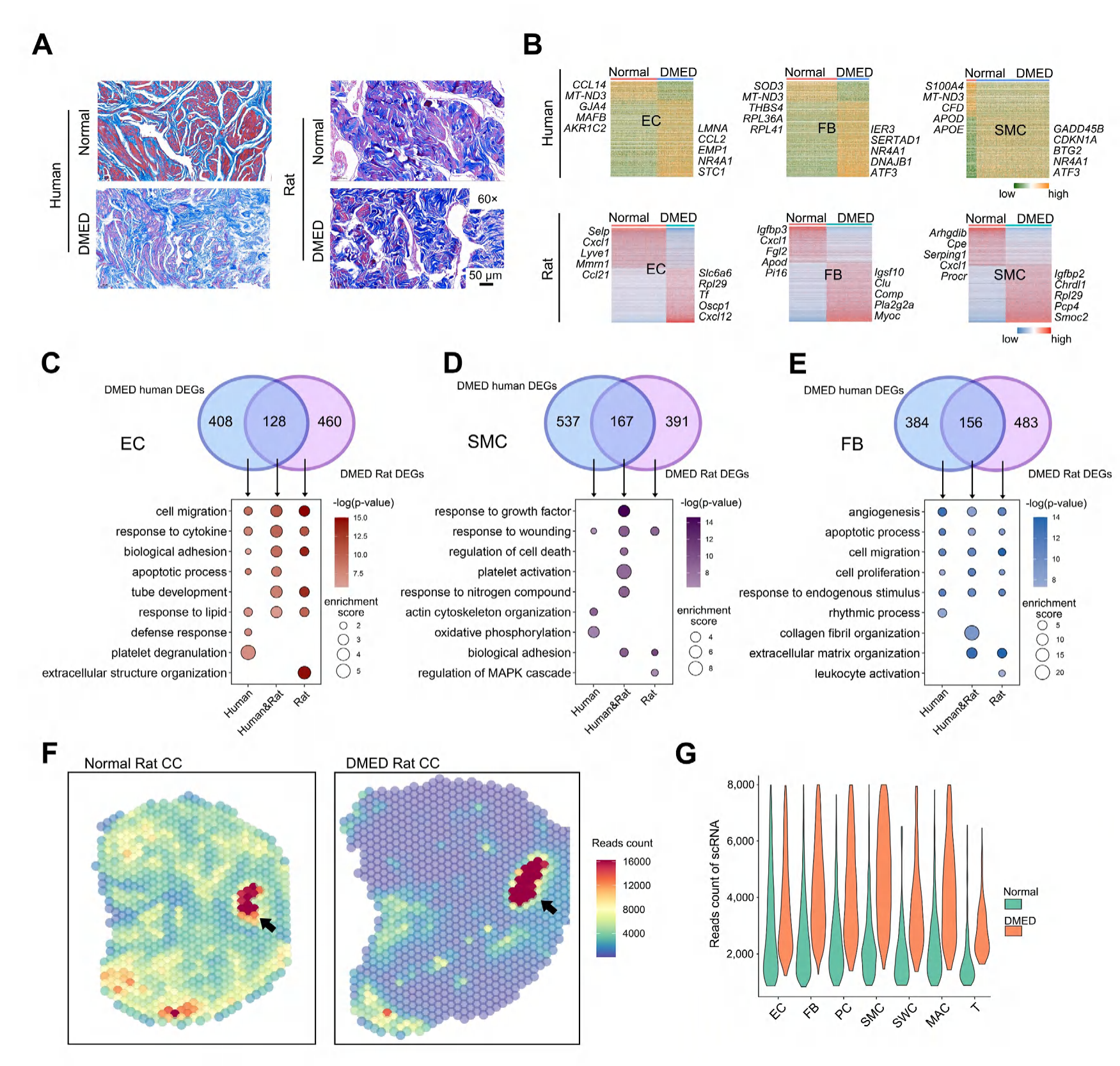 為了更好的認識DMED病理條件下,人類和大鼠CC微環(huán)境發(fā)生的變化是否與每種CC細胞類型中發(fā)生的分子水平變化相一致,研究者通過分析scRNA-seq數(shù)據(jù),發(fā)現(xiàn)DMED大鼠模型和DMED患者都經(jīng)歷了顯著的纖維化以及細胞組分丟失,但兩者間的轉(zhuǎn)錄組差異顯著。富集分析結(jié)果顯示,僅DMED大鼠模型富集了“extracellular structure organization”;“actin cytoskeleton or organization”和“oxidative phosphorylation”僅在人類DMED患者SMC中發(fā)現(xiàn),“regulation of MARK cascade”僅在DMED大鼠模型SMC中富集;“rhythmic process”僅在人類DMED患者FB中富集,“l(fā)eukocyte activation”僅在DMED大鼠模型FB中富集。