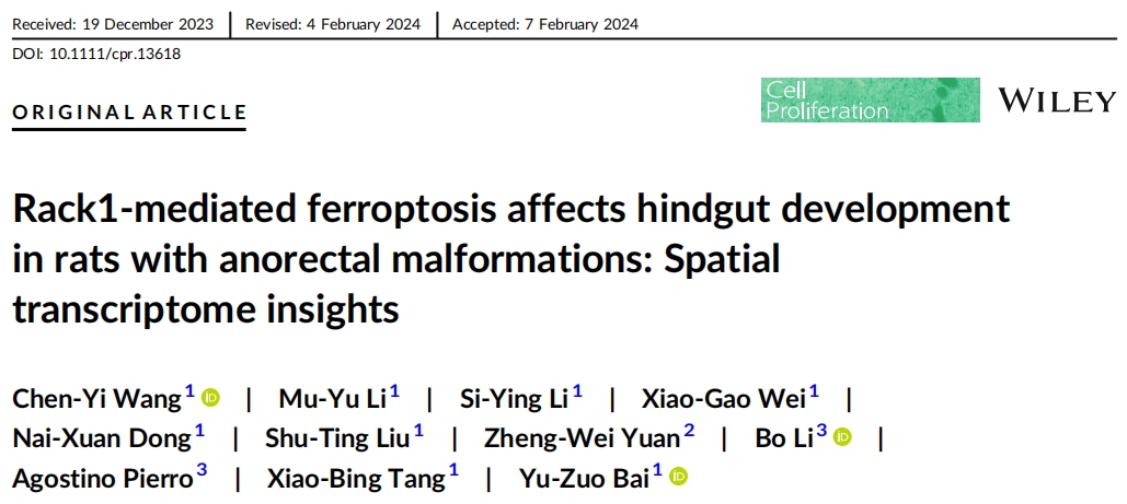 2024年7月,中國醫(yī)科大學(xué)盛京醫(yī)院在國際學(xué)術(shù)期刊cell proliferation發(fā)表一項重要研究成果,題為:Rack1‐mediated ferroptosis affects hindgut development in rats with anorectal malformations: Spatial transcriptome insights。使用空間轉(zhuǎn)錄組測序、免疫熒光、CCK-8、WB、ROS檢測等來剖析直腸肛門畸形的發(fā)育機制。