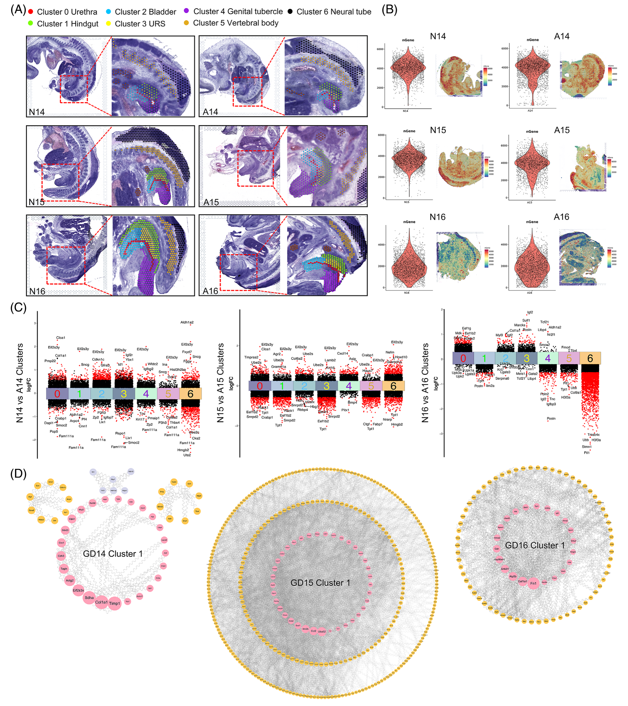 在這項研究中,作者在 GDs 14-16 (稱為 N14-16) 上使用正常的 Wistar 大鼠胚胎,在 GDs 14-16 (稱為 A14-16) 上使用 ETU 誘導(dǎo)的 ARM 胚胎進行空間轉(zhuǎn)錄組測序。制備大鼠胚胎的 6 個冷凍中矢狀切片,每個 10 μm 厚。這些切片包括尿道和后腸層,提供了特定時間點泄殖腔發(fā)育的全面視圖(圖 1A)。使用 10× Genomics Visium 空間轉(zhuǎn)錄組技術(shù),然后進行組織透化、cDNA 合成和文庫構(gòu)建,作者成功地捕獲了正常和 ARM 胚胎中的視覺基因轉(zhuǎn)錄數(shù)據(jù),主要來自泄殖腔區(qū)域。為了確保來自同一區(qū)域的各種切片樣本之間的可比性和一致性,作者進行了聚類注釋,產(chǎn)生了七個不同的聚類。這些集群包括泄殖腔區(qū)域內(nèi)的五個特定區(qū)域(集群 0-4),即尿道、后腸、膀胱、URS 和生殖器結(jié)節(jié)。此外,兩個簇 (簇 5 和 6) 對應(yīng)于椎體和神經(jīng)管區(qū)域 (圖 1A)。平均而言,每個解剖區(qū)域覆蓋 3005 個點,每個點捕獲 16,905 個基因(圖 1B)。