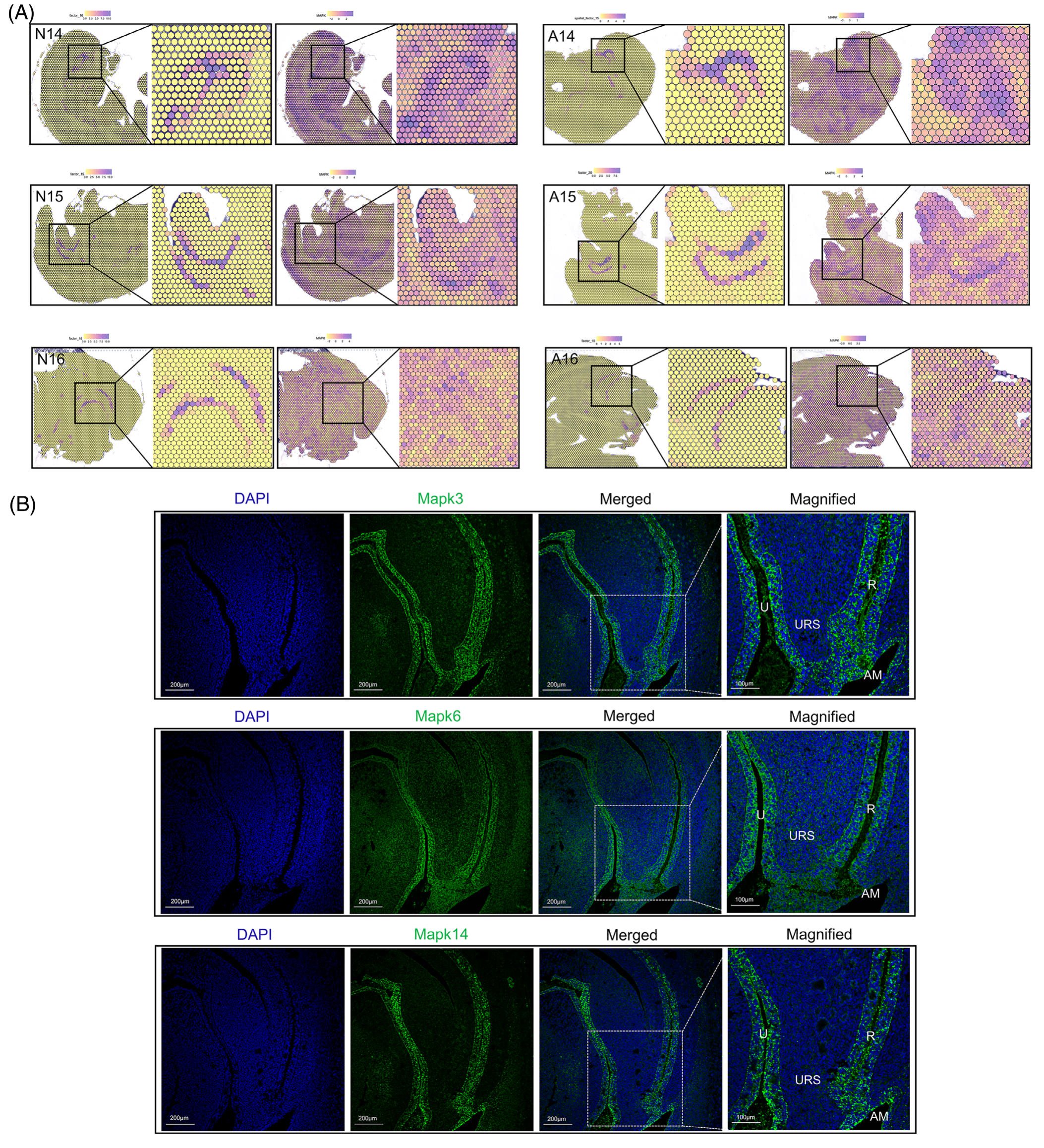 PROGENy 算法用于通過下游基因表達的變化評估信號通路的活性。作者獲得了正常組和 ARM 組 GDs 14-16 樣本中不同通路的活性水平評分。在使用 NNMF 對后腸區(qū)域(N14 因子 16、A14 因子 15、N15 因子 15、A15 因子 20、N16 因子 18 和 A16 因子 10)進行聚類分析中,PROGENy 算法顯示與 MAPK 信號通路呈強正相關(guān),表明 MAPK 信號在后腸中顯著富集(圖 3A)。從這些區(qū)域提取來自 Erk、P38、JNK 和 Erk5 家族的 12 個成員分子的定位表達模式。具體來說,Mapk3 、 Mapk6 和 Mapk14 主要富集在泄殖腔區(qū)域。這些蛋白質(zhì)的免疫熒光驗證證實了它們在尿道和后腸區(qū)域的特異性表達,在 URS 和間質(zhì)區(qū)域的表達相對較弱,這與 PROGENy 預(yù)測一致(圖 3B)。