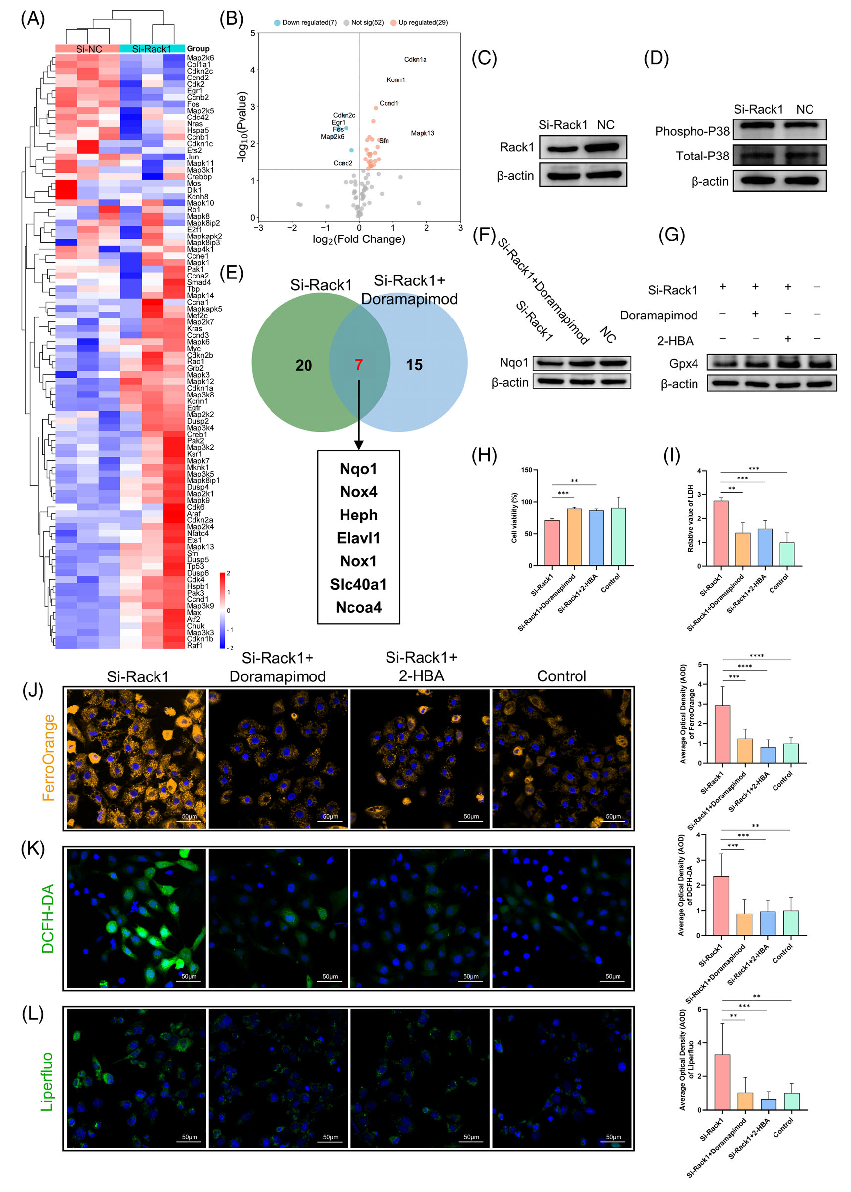在 IEC-6 細胞敲低 Rack1 的同時,使用 doramapimod 和 2-HBA 進行拯救實驗。結(jié)果顯示,與單獨的 Rack1 敲低相比,添加 doramapimod 和 2-HBA 導(dǎo)致細胞活力增加和相對 LDH 含量降低 (p < 0.05;圖 6H,I)。此外,在添加 doramapimod 和 2-HBA 后,細胞內(nèi)亞鐵離子濃度降低,同時 ROS 和脂質(zhì)過氧化水平降低(p < 0.05;圖 6J-L)。這些發(fā)現(xiàn)表明,Rack1 通過P38信號通路和 Nqo1 調(diào)節(jié)細胞內(nèi)鐵含量和脂質(zhì)過氧化,從而介導(dǎo)腸上皮細胞的鐵死亡。