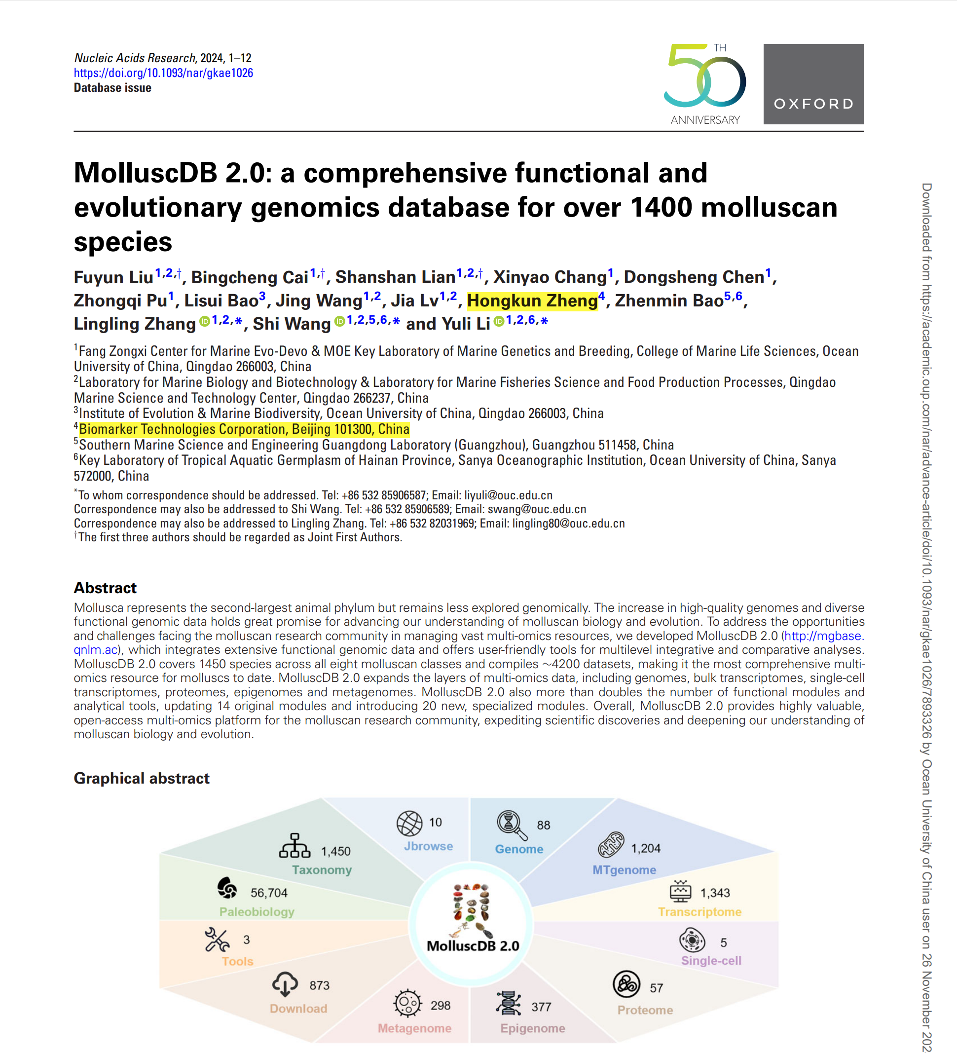 中國海洋大學(xué)“海洋生物遺傳學(xué)與育種”教育部重點(diǎn)實(shí)驗(yàn)室、方宗熙海洋生物進(jìn)化與發(fā)育中心包振民院士和王師教授團(tuán)隊(duì)在國際生物信息數(shù)據(jù)庫領(lǐng)域頂刊Nucleic Acids Research在線發(fā)表了軟體動(dòng)物功能和進(jìn)化基因組學(xué)綜合數(shù)據(jù)庫“MolluscDB 2.0: a comprehensive functional and evolutionary genomics database for over 1400 molluscan species”(MolluscDB 2.0:面向超過1400個(gè)軟體動(dòng)物種類的功能和進(jìn)化基因組學(xué)綜合數(shù)據(jù)庫)。