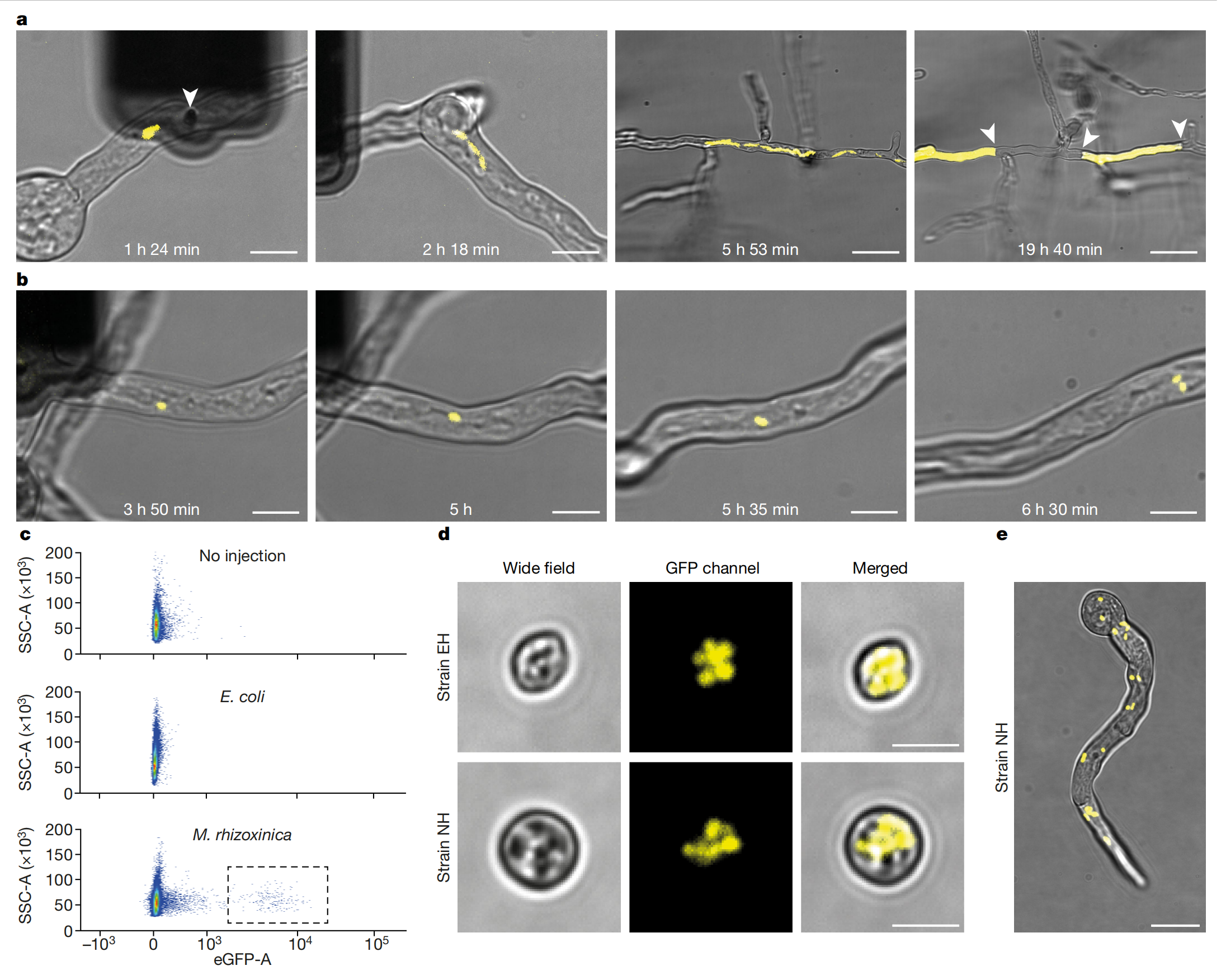 使用 FluidFM 技術(shù),在不破壞真菌小孢根霉(R. microsporus)細(xì)胞的情況下將細(xì)菌植入其中,通過該技術(shù),單次注射可將1-30個(gè)細(xì)菌注入R. microsporus內(nèi),同時(shí)可通過實(shí)時(shí)成像觀察人工誘導(dǎo)的內(nèi)共生現(xiàn)象的命運(yùn)。用GFP標(biāo)記的M. rhizoxinica注射入EH型絲狀真菌,細(xì)菌成功在絲狀真菌內(nèi)定殖并能垂直傳遞(遺傳),表明通過注射方法可以重建自然內(nèi)共生。
