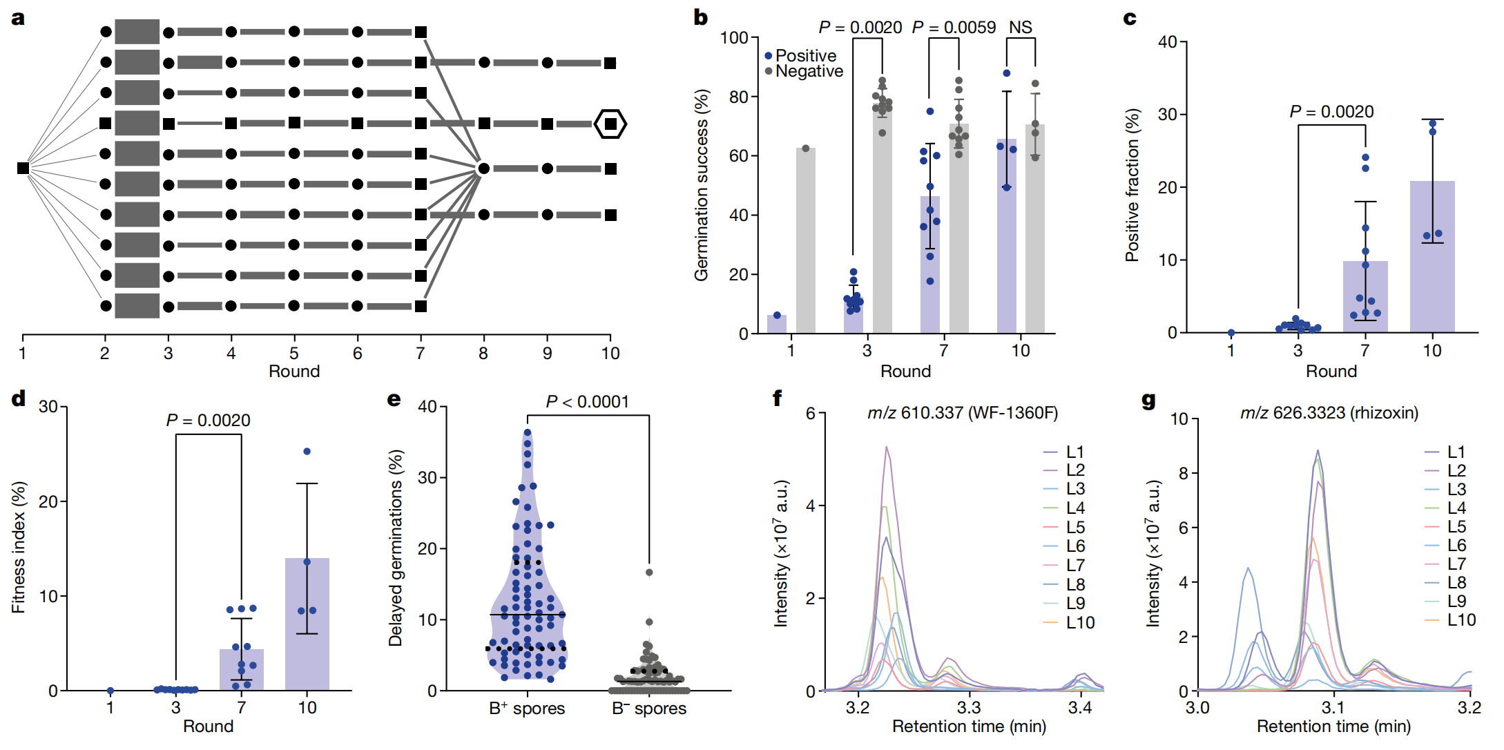 為進(jìn)一步提高人工誘導(dǎo)的NH-根霉生菌內(nèi)共生體系的遺傳穩(wěn)定性,進(jìn)行多輪生長和篩選,以施加正向選擇壓力。隨著進(jìn)化過程的進(jìn)行,攜帶細(xì)菌的孢子的萌發(fā)率逐漸提高,并且攜帶細(xì)菌的孢子的比例也顯著增加,而真菌也在適應(yīng)性進(jìn)化過程中發(fā)生了基因突變,這些突變可能與內(nèi)吞作用有關(guān),這與共生關(guān)系的穩(wěn)定性和適應(yīng)性的提高相一致。需要注意的是,由于真菌基因組研究不足,且存在潛在的表觀遺傳效應(yīng),這些推測(cè)仍需進(jìn)一步驗(yàn)證。在適應(yīng)性進(jìn)化后的共生關(guān)系中,M. rhizoxinica?能在新的宿主菌株 NH 中能夠產(chǎn)生次級(jí)代謝產(chǎn)物 WF-1360F,而根霉菌株 NH 能夠?qū)?WF-1360F 轉(zhuǎn)化為 rhizoxin。這表明,通過誘導(dǎo)內(nèi)共生可以將新的代謝功能轉(zhuǎn)移到宿主中。