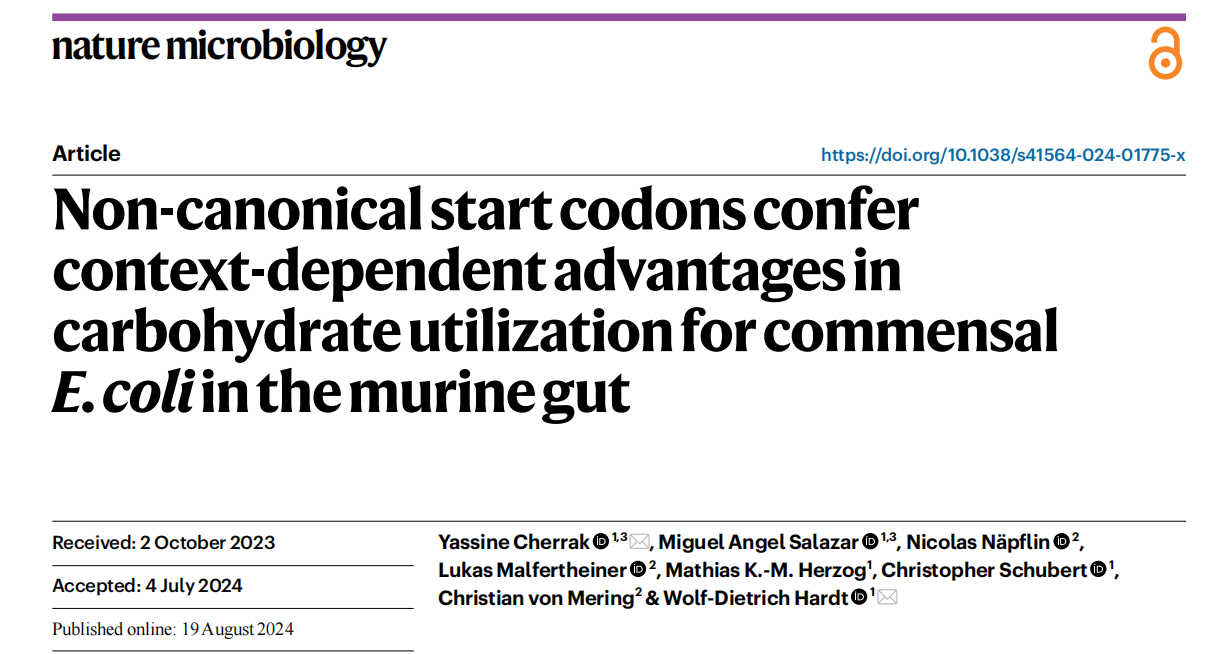 Cherrak Y, Salazar MA, N?pflin N, et al. Non-canonical start codons confer context-dependent advantages in carbohydrate utilization for commensal E. coli in the murine gut.Nat Microbiol.2024;9(10):2696-2709. doi:10.1038/s41564-024-01775-x.