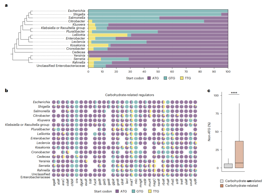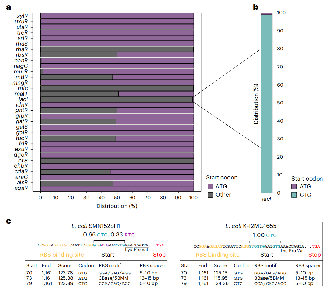 研究人員分析了 10643 個(gè)大腸桿菌基因組,發(fā)現(xiàn) 32 個(gè)碳水化合物代謝調(diào)節(jié)基因中,有 13 個(gè)基因具有非標(biāo)準(zhǔn)起始密碼子,例如 GTG 或 TTG。其中,lacI 基因幾乎全部包含非標(biāo)準(zhǔn)起始密碼子,而 rbsR、murR、mltR、malT、gntR、gatR、fucR、araC 和 alsR 等基因則同時(shí)存在 ATG 和非標(biāo)準(zhǔn)起始密碼子。這種現(xiàn)象表明非標(biāo)準(zhǔn)起始密碼子在碳水化合物代謝調(diào)節(jié)中可能具有重要作用。