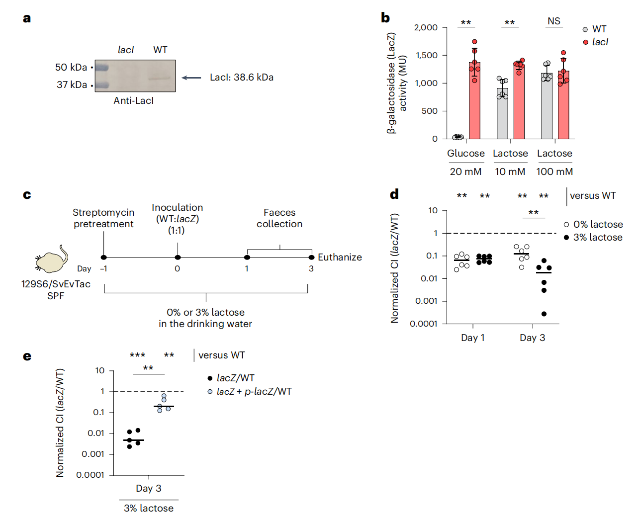 研究人員使用小鼠模型,比較了野生型大腸桿菌 8178 菌株和 lacZ 突變體菌株在富含乳糖條件下的生長情況。結(jié)果顯示,野生型菌株的生長速度更快,這表明 lacZYA 操縱子在腸道定植中起著重要作用。lacZYA 操縱子負(fù)責(zé)乳糖的代謝,野生型菌株能夠更有效地利用乳糖,從而獲得競(jìng)爭優(yōu)勢(shì)。