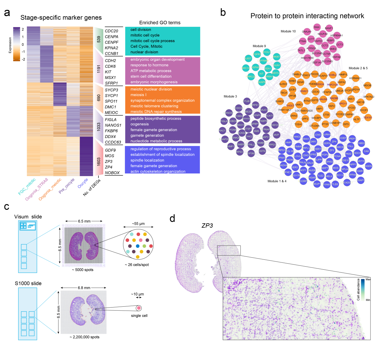 為了進一步驗證分析,研究人員還在同一E65卵巢組織上使用了更高分辨率(BMKMANU S1000;Spot點大小約為10微米)的平臺進行了ST測序。結(jié)果與E65時的Visium ST解卷積一致,使用S1000平臺在E65時可視化ZP3陽性卵母細胞的空間位置也證實了其在內(nèi)皮層的表達。