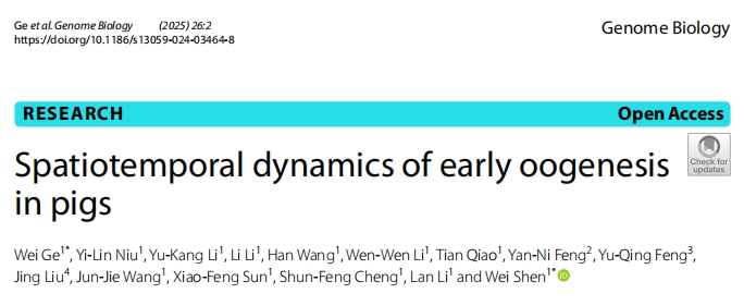 2025年1月,青島農(nóng)業(yè)大學葛偉教授與沈偉教授團隊在學術(shù)期刊《Genome Biology》上發(fā)表了一篇題為《Spatiotemporal dynamics of early oogenesis in pigs》的研究論文。該研究利用了單細胞RNA測序和空間轉(zhuǎn)錄組技術(shù),解析了豬早期卵子發(fā)生中的基因表達及空間組織特征。研究發(fā)現(xiàn),豬生殖細胞在卵巢中呈“皮質(zhì)到髓質(zhì)”分布,且與人類卵子發(fā)生過程相似,表明豬是研究人類卵子發(fā)生的良好模型。RNA速度分析揭示了顆粒細胞譜系特征,空間共定位分析和細胞通訊分析顯示皮質(zhì)與髓質(zhì)區(qū)域生殖細胞與體細胞通訊模式不同,特別是NOTCH信號通路和ECM蛋白在調(diào)控中起關(guān)鍵作用,強調(diào)了卵巢微環(huán)境對生殖細胞命運的重要性。