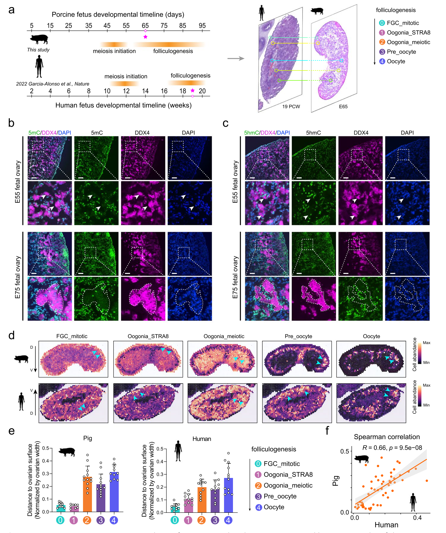 為了深入理解哺乳動物卵母細胞生成的空間調(diào)控機制,研究人員進行了跨物種分析。研究團隊首先獲取了妊娠后19周人類卵巢的空間轉(zhuǎn)錄組(ST)數(shù)據(jù),并將其與豬E65時期的ST數(shù)據(jù)進行了比較,以分析卵母細胞生成各階段生殖細胞的空間位置模式。與人類情況一致的是,生殖細胞標記DDX4與5mC和5hmC的共染色顯示,在E55和E75豬卵巢中,5mC和5hmC信號在DDX4陽性細胞中不可檢測,且主要在周圍性腺體細胞中表達。這些結(jié)果進一步揭示,除了保守的基因表達程序外,人類和豬在早期卵母細胞生成過程中的表觀遺傳重編程模式也是保守的。