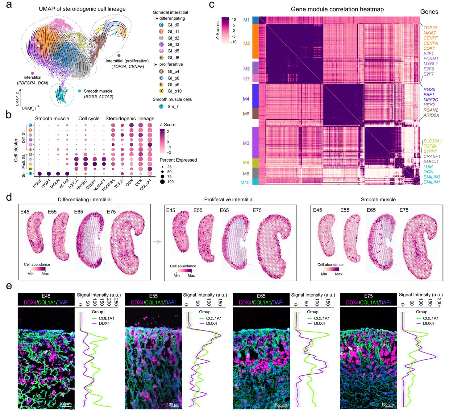 研究方法:scRNA-seq(E45、E55、E65、E75胚胎卵巢,共計18,956個高質(zhì)量細胞,10x Genomics Chromium);空間轉(zhuǎn)錄組(E45、E55、E65、E75胚胎卵巢,10x Visium;E65胚胎卵巢,BMKMANU S1000)