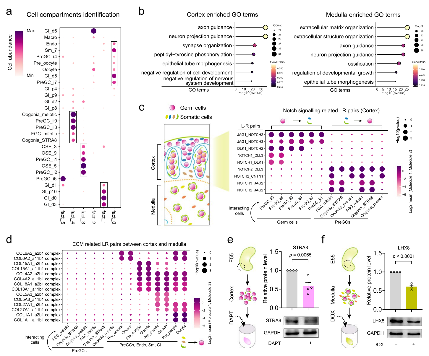 為了進一步驗證細胞通訊分析,研究人員接下來探討了在使用從E55卵巢皮質(zhì)和髓質(zhì)中分離的卵巢組織進行體外條件下,補充NOTCH信號抑制劑DAPT和基質(zhì)金屬蛋白酶抑制劑多西環(huán)素是否會影響生殖細胞命運。從E55胎兒卵巢中解剖出皮質(zhì)和髓質(zhì)組織,將這些組織進行體外培養(yǎng),并在用DAPT處理10天后觀察到皮質(zhì)卵巢組織中減數(shù)分裂標志物STRA8的表達水平顯著降低,而髓質(zhì)卵巢組織則沒有這種情況。相反,在用基質(zhì)金屬蛋白酶抑制劑多西環(huán)素處理10天后,觀察到卵泡形成標志物LHX8的表達水平降低,而在皮質(zhì)組織中未觀察到可比的影響。綜上所述,這些數(shù)據(jù)進一步支持了在空間背景下的細胞-細胞通訊分析,并強調(diào)了卵巢微環(huán)境在調(diào)節(jié)生殖細胞命運中的重要作用。