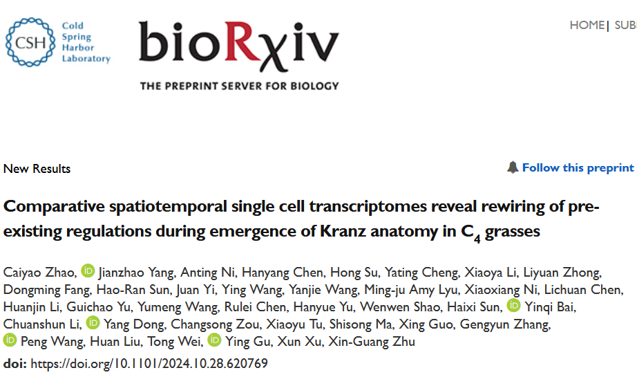 [6] Zhao C, Yang J, Ni A, et al. Comparative spatiotemporal single cell transcriptomes reveal rewiring of pre-existing regulations during emergence of Kranz anatomy in C4 grasses[J]. bioRxiv, 2024. doi: https://doi.org/10.1101/2024.10.28.620769.