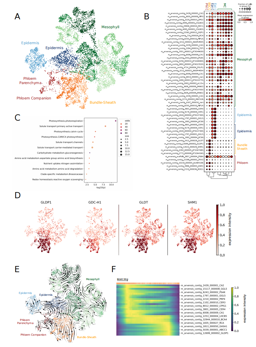 ② 該研究利用最近在單細(xì)胞轉(zhuǎn)錄組測(cè)序方面的進(jìn)展,更好地理解新的細(xì)胞特化如何影響相互關(guān)聯(lián)的途徑。研究人員為具有C3-C4中間特征的堇娘芥(Moricandia arvensis)生成了單細(xì)胞核RNA測(cè)序數(shù)據(jù)集,并將其與公開可用的C3擬南芥(Arabidopsis thaliana)葉組織的單細(xì)胞轉(zhuǎn)錄組進(jìn)行了比較,還通過免疫金標(biāo)記技術(shù)結(jié)合電子顯微鏡獨(dú)立驗(yàn)證了選定光呼吸蛋白的定位。