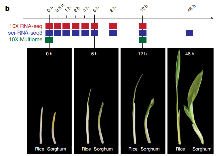 單細(xì)胞核轉(zhuǎn)錄組:水稻和高粱幼苗暗生長(zhǎng)5天后,在光周期(12h光/12h暗)中采集0h(暗)、0.5h、1h、2h、4h、6h、8h、12h、48h共9個(gè)時(shí)間點(diǎn)的地上組織??傆?jì)水稻190,569個(gè)核、高粱265,701個(gè)核。