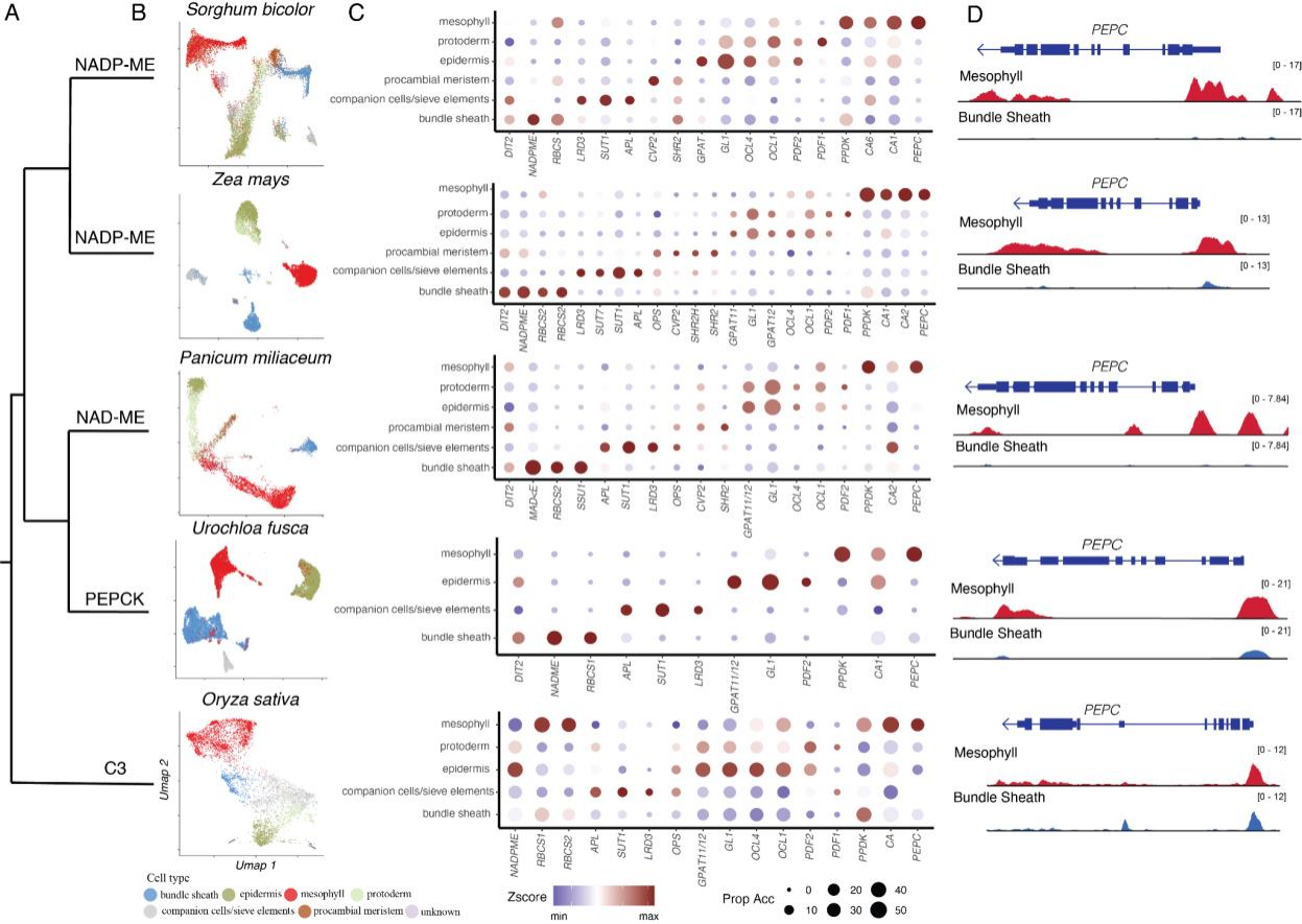 ② 該研究使用單細(xì)胞sci-ATAC-seq來鑒定與C4酶相關(guān)的特異細(xì)胞類型的可及染色質(zhì)區(qū)域(ACRs),研究涵蓋了五種不同的禾本科植物,包括四種C4植物和一種C3植物。其中,C4植物分屬三種不同的光合亞型:玉米(Zea mays)和高粱(Sorghum bicolor)屬于NADP-ME亞型;黍(Panicum miliaceum)屬于NAD-ME亞型;Urochloa fusca屬于PEPCK亞型;C3植物水稻(Oryza sativa