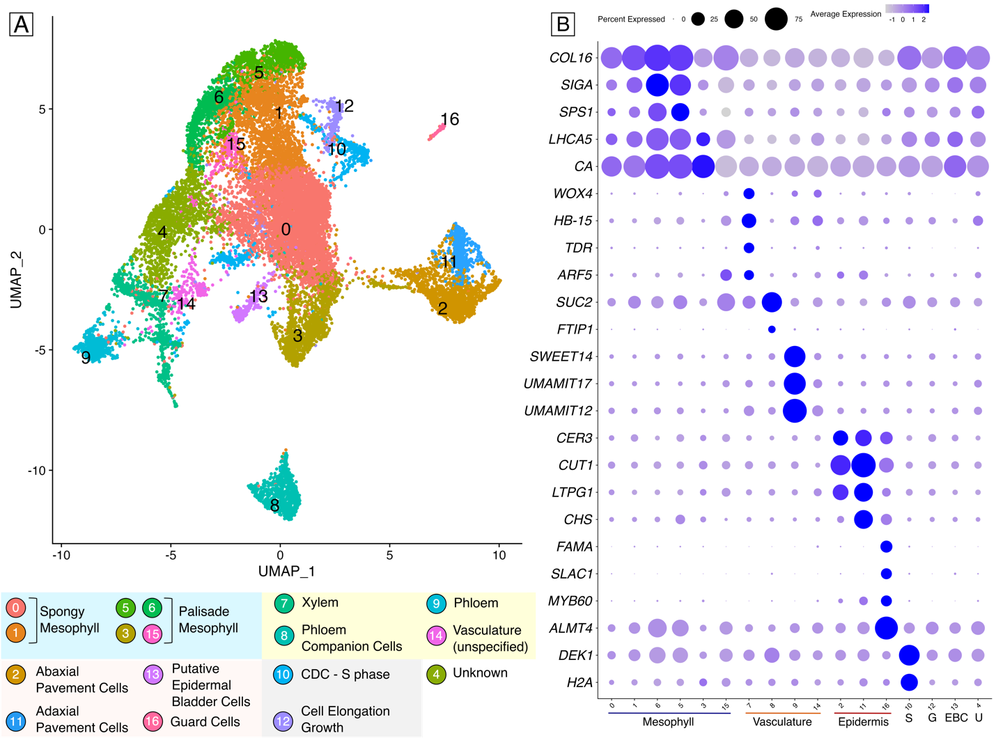 單細(xì)胞核測(cè)序:共獲取17,994個(gè)高質(zhì)量核,注釋17個(gè)細(xì)胞簇,覆蓋葉肉(海綿/柵欄)、表皮、保衛(wèi)細(xì)胞、木質(zhì)部、韌皮部等