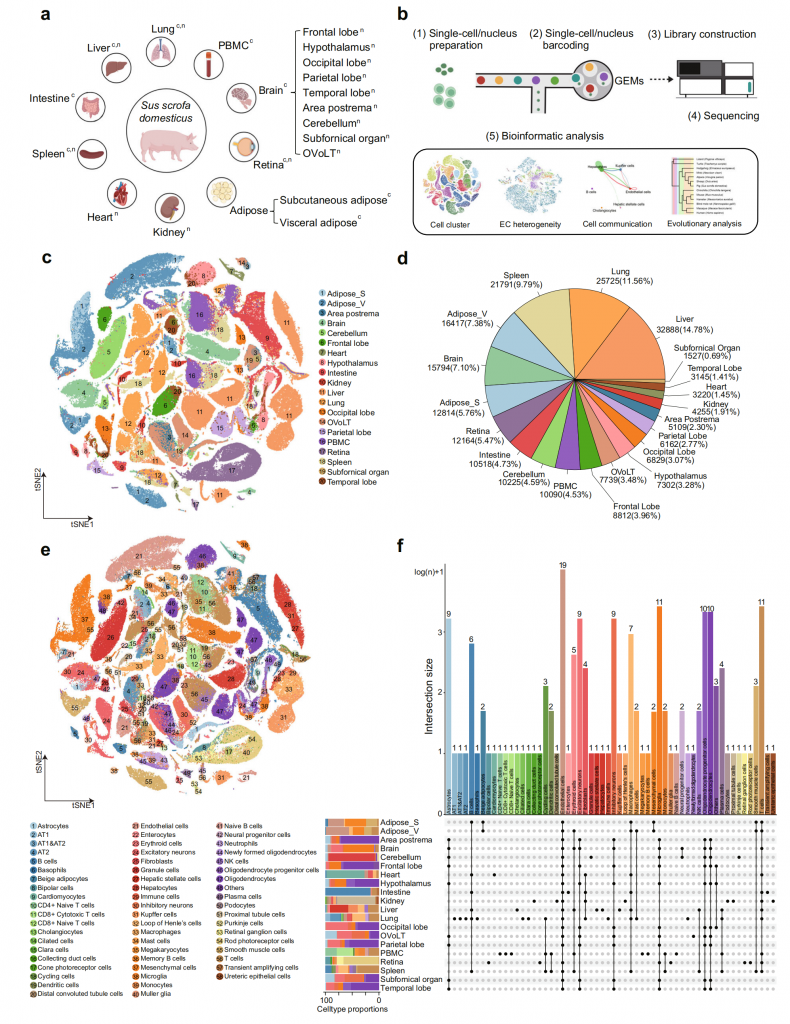 ① 使用單細(xì)胞轉(zhuǎn)錄組測(cè)序及單細(xì)胞核轉(zhuǎn)錄組測(cè)序,構(gòu)建首個(gè)家豬多器官單細(xì)胞圖譜,得到234種降維聚類(lèi)簇,鑒定出58種細(xì)胞類(lèi)型及其相關(guān)的顯著富集標(biāo)志基因,搭建了可視化家豬單細(xì)胞轉(zhuǎn)錄組數(shù)據(jù)庫(kù)(Pig Single Cell Atlas Database)。
