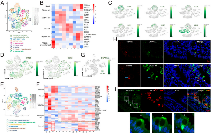① 首次繪制感染PEDV(豬流行性腹瀉病毒)的仔豬小腸單細(xì)胞圖譜,使用人小腸細(xì)胞類(lèi)型marker鑒定出12種細(xì)胞類(lèi)型,發(fā)現(xiàn)豬小腸tuft細(xì)胞新特異性標(biāo)志基因DNAH11,結(jié)果表明多數(shù)人小腸特異性marker也可以用到豬研究中。此外,豬小腸Th17細(xì)胞(3和9簇)特異性高表達(dá)IL17A、IL7F和IL22,但不高表達(dá)T細(xì)胞代表性CD3,這可能與豬T細(xì)胞分化有關(guān)。
