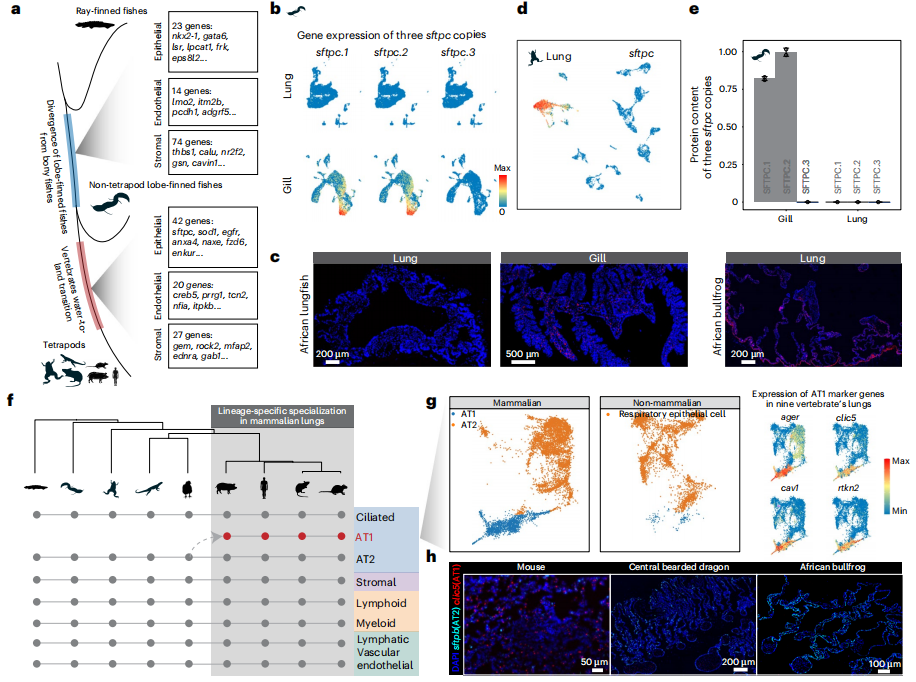③ 全基因組復(fù)制對(duì)肺演化很重要,1866個(gè)肺相關(guān)直系同源基因中有776個(gè)是脊椎動(dòng)物兩輪全基因組復(fù)制(2R-WGD)的產(chǎn)物;哺乳動(dòng)物譜系特異的基因復(fù)制也十分重要,sfta2-/-小鼠表現(xiàn)出明顯的呼吸疾病,包括顯著的炎癥。