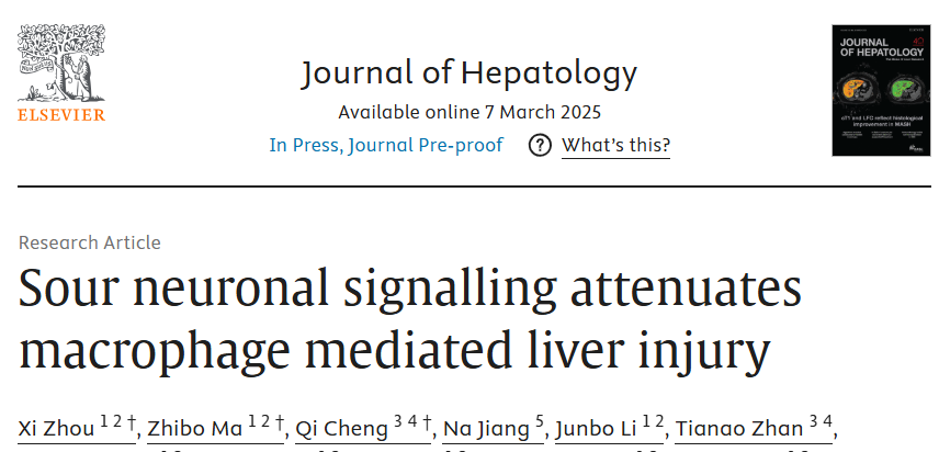 2025年3月,華中科技大學(xué)同濟(jì)醫(yī)學(xué)院附屬同濟(jì)醫(yī)院器官移植研究所蘭培祥教授、陳知水教授和肝臟外科程琪教授研究團(tuán)隊(duì)在Journal of Hepatology發(fā)表題為”Sour Neuronal Signalling Attenuates Macrophage Mediated Liver Injury”的研究論文。研究使用單細(xì)胞轉(zhuǎn)錄組測(cè)序技術(shù)等多種技術(shù),深入闡述人鼠中減輕肝缺血再灌注損傷的腦-肝軸調(diào)控通路,發(fā)現(xiàn)酸味刺激竟然可以通過(guò)神經(jīng)信號(hào)緩解肝臟損傷!這一發(fā)現(xiàn)不僅為肝臟疾病的治療提供了新思路,還從現(xiàn)代科學(xué)的角度驗(yàn)證了中醫(yī)“酸入肝”的理論。