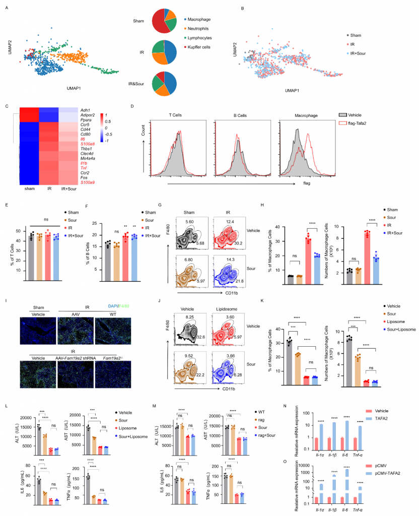 體外實(shí)驗(yàn)發(fā)現(xiàn)TAFA2不引起肝細(xì)胞凋亡;snRNA-seq數(shù)據(jù)顯示IRI肝中巨噬細(xì)胞比例增加且炎癥相關(guān)基因表達(dá)水平增加,但在酸刺激組中降低;流式細(xì)胞術(shù)實(shí)驗(yàn)結(jié)果表明,TAFA2與巨噬細(xì)胞結(jié)合而不與T/B細(xì)胞結(jié)合,不論是否酸刺激T/B細(xì)胞比例無(wú)顯著變化,IRI肝中CD11b+F4/80low?巨噬細(xì)胞增加而酸刺激可降低該巨噬細(xì)胞數(shù)量;TAFA2敲除或敲低抑制IRI肝中巨噬細(xì)胞的浸潤(rùn),這些結(jié)果表明TAFA2促進(jìn)巨噬細(xì)胞活化。體外實(shí)驗(yàn)結(jié)果表明,TAFA2可以激活BMDM(骨髓來(lái)源巨噬細(xì)胞),引起Il1α,Il1β,Il6和Tnfα的表達(dá),這些結(jié)果表明TAFA2激活的巨噬細(xì)胞介導(dǎo)了肝IRI。