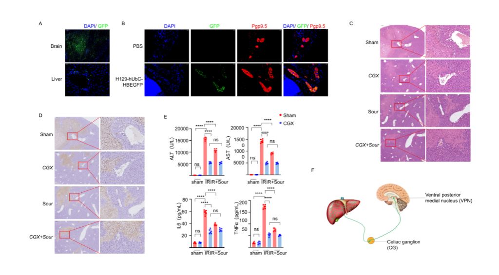 研究者首先構(gòu)建酸刺激下肝臟缺血再灌注損傷(IRI)小鼠模型,發(fā)現(xiàn)酸刺激可以減少肝組織損傷以及血清標(biāo)志物水平。但是,使用丁卡因局麻小鼠舌頭或者灌胃檸檬酸不能減少肝損傷和血清標(biāo)志物水平;NMDAR阻斷劑1(阻斷NMDAR介導(dǎo)的興奮性突觸傳遞)立體定位注射到腹后內(nèi)側(cè)核(VPN)后,酸刺激后IRI肝的血清標(biāo)志物水平和肝損傷程度無(wú)明顯變化,表明神經(jīng)系統(tǒng)在酸刺激減輕IRI過(guò)程中起重要作用。此外,小鼠VPN注射示蹤病毒的實(shí)驗(yàn)結(jié)果顯示,肝臟以及CG(腹腔神經(jīng)節(jié))均檢測(cè)到熒光,行腹腔神經(jīng)節(jié)切除術(shù)能降低IRI肝的組織損傷和血清標(biāo)志物水平,表明酸刺激減輕肝損傷過(guò)程通過(guò)腦-CG-肝軸。