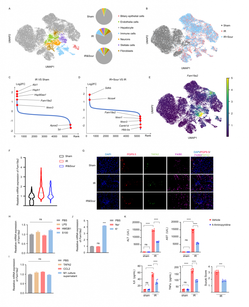 對(duì)肝IRI小鼠、酸刺激后肝IRI小鼠及sham(假手術(shù))小鼠的肝臟和CG進(jìn)行單細(xì)胞核轉(zhuǎn)錄組測(cè)序,結(jié)果顯示IRI引起肝細(xì)胞和神經(jīng)元基因表達(dá)譜發(fā)生變化,IRI肝中免疫細(xì)胞數(shù)量增加,但酸刺激后IRI樣本中免疫細(xì)胞數(shù)量減少。神經(jīng)元較為特異性地表達(dá)TAFA2,IRI可引起肝神經(jīng)元TAFA2表達(dá)水平增加,但酸刺激使得TAFA2表達(dá)水平降到與sham對(duì)照組相近水平。實(shí)驗(yàn)發(fā)現(xiàn)鉀離子可引起小鼠海馬神經(jīng)元細(xì)胞系HT22顯著高表達(dá)TAFA2,使用鉀離子通道抑制劑可減輕肝損傷,支持酸刺激通過(guò)神經(jīng)系統(tǒng)減輕肝損傷的假設(shè)。進(jìn)一步的,使用慢病毒敲低神經(jīng)元TAFA2表達(dá)水平或使用TAFA2敲基因鼠,發(fā)現(xiàn)IRI引起的肝組織損傷、巨噬細(xì)胞浸潤(rùn)以及血清標(biāo)志物水平降低,表明TAFA2在肝IRI中有著重要作用。