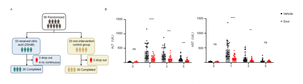 為了確認(rèn)酸刺激在人類肝IRI中的作用,研究者進(jìn)行了開(kāi)放、隨機(jī)、空白對(duì)照臨床試驗(yàn)(ChiCTR2400088096),包含多種良性/惡性肝腫瘤、肝外傷、膿腫、囊腫和包蟲(chóng)病,由于手術(shù)期間門靜脈短暫阻斷以減少肝切除過(guò)程中出血,導(dǎo)致肝出現(xiàn)缺血再灌注損傷。干預(yù)組33名患者,術(shù)前24h開(kāi)始,每8h給與新鮮的25mM檸檬酸(持續(xù)5min),對(duì)照組33名患者不接受酸刺激,剔除6名術(shù)中肝缺血超過(guò)30min患者以及4名依從性差患者,肝切除術(shù)后第1/3/5天對(duì)患者肝功能進(jìn)行評(píng)估,結(jié)果顯示酸刺激組血清ALT和AST水平顯著低于對(duì)照組,高ALT水平(>500 U/L)患者數(shù)量也顯著更低,這些結(jié)果表明酸刺激可減輕人類肝切除術(shù)引起的肝IRI。