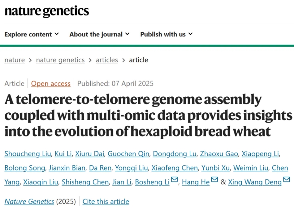 2025年4月7日,濰坊現(xiàn)代農(nóng)業(yè)山東省實驗室/北京大學(xué)現(xiàn)代農(nóng)業(yè)研究院和小麥育種全國重點實驗室鄧興旺、何航、李博生團(tuán)隊在國際頂尖期刊《自然-遺傳學(xué)》(Nature Genetics)上發(fā)表題為“A telomere-to-telomere genome assembly coupled with multi-omic data provides insights into the evolution of hexaploid bread wheat”的突破性成果:成功繪制了六倍體小麥的端粒到端粒(T2T)完整基因組圖譜,實現(xiàn)了小麥基因組從“頭”到“尾”無缺口的精確組裝。這一在山東完成的成果,為我國主糧作物高水平科技自立自強(qiáng)、牢牢把握糧食安全主動權(quán)提供了重要支撐。