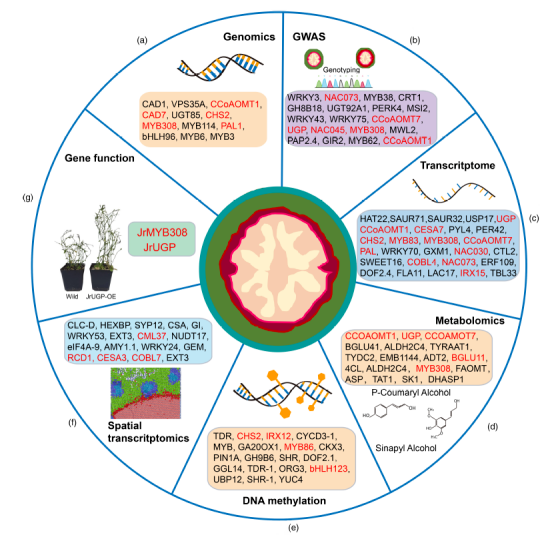 通過(guò)對(duì)十一個(gè)發(fā)育階段的轉(zhuǎn)錄組學(xué)、代謝組學(xué)、DNA甲基化和空間轉(zhuǎn)錄組學(xué)等多組學(xué)分析,揭示了多個(gè)與次生細(xì)胞生物合成和木質(zhì)素積累相關(guān)的候選基因,例如UGP、MYB308、MYB83、NAC043、NAC073、CCoAOMT1、CCoAOMT7、CHS2、CESA7、LAC7、COBL4和IRX12。在擬南芥(Arabidopsis thaliana)中過(guò)表達(dá)JrUGPJrMYB308驗(yàn)證了它們?cè)谀举|(zhì)素生物合成和細(xì)胞壁加厚中的作用。
