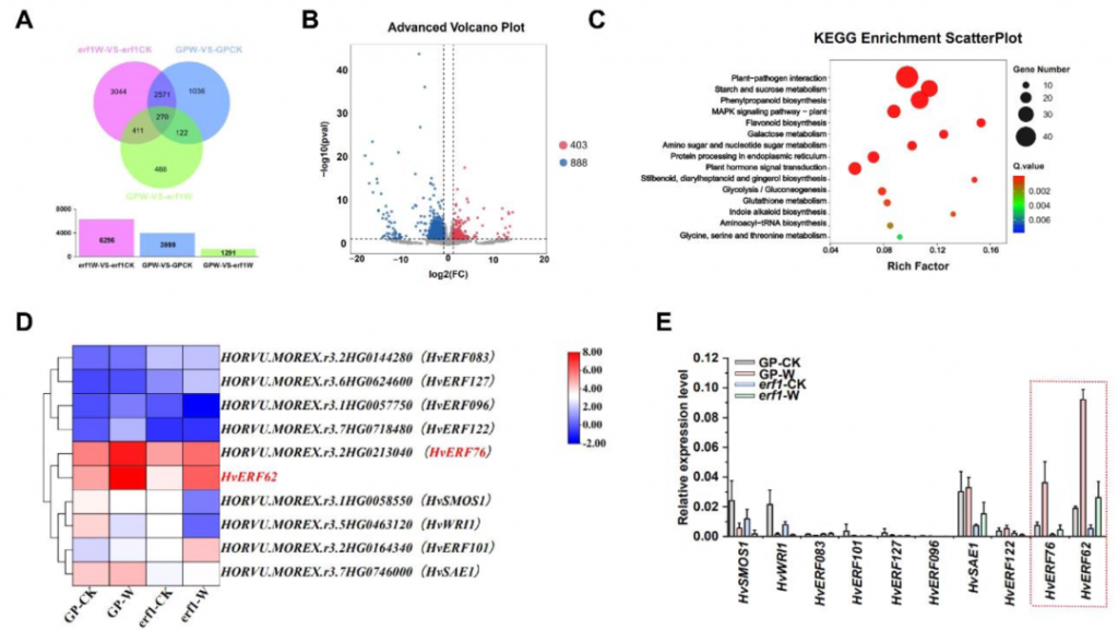 對野生型和 HvERF62 突變體進(jìn)行轉(zhuǎn)錄組測序分析。結(jié)果顯示,在漬澇脅迫下,突變體中有403個(gè)基因上調(diào)表達(dá),888個(gè)基因下調(diào)表達(dá)(圖5A, 5B)。KEGG富集分析表明,這些差異表達(dá)基因顯著富集在植物-病原互作、淀粉和蔗糖代謝、苯丙烷類生物合成、MAPK信號通路、植物激素信號轉(zhuǎn)導(dǎo)、糖酵解/糖異生等通路中(圖5C)。