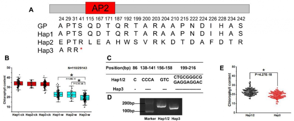 對自然群體中 HvERF62 基因的序列進(jìn)行分析,發(fā)現(xiàn)存在43個(gè)SNPs和4個(gè)InDels。根據(jù)這些變異,將種質(zhì)資源分為3個(gè)單倍型(Hap1、Hap2和Hap3)。其中,Hap3由于序列變異導(dǎo)致編碼提前終止。在漬澇脅迫下,Hap1和Hap2的葉綠素含量顯著高于Hap3(圖10A, 10B)。基于InDel變異設(shè)計(jì)的分子標(biāo)記可用于區(qū)分不同單倍型(圖10C-10E)。