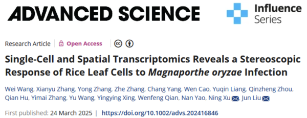 2025年3月24日,中國農(nóng)業(yè)大學植物保護學院劉俊團隊在國際綜合性期刊《Advanced Science》上,在線發(fā)表了題為“Single-Cell and Spatial Transcriptomics Reveals a Stereoscopic Response of Rice Leaf Cells to?Magnaportheoryzae?Infection”的研究長文,該研究利用單細胞核轉錄組測序和空間轉錄組測序技術,深度分析了水稻-稻瘟菌互作下的細胞空間立體響應,并構建了一個全新的水稻-稻瘟菌互作單細胞和時空組轉錄圖譜。