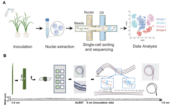 單細胞組學和時空組學是近年來生命科學領域的重要技術突破,它們在細胞異質(zhì)性解析、動態(tài)過程研究和細胞間相互作用分析方面具有重要優(yōu)勢,為生命科學研究帶來了全新的視角和深度。水稻稻瘟病是世界上發(fā)生嚴重的真菌病害之一,水稻在面臨稻瘟菌侵染時會激活動態(tài)免疫,因此挖掘水稻特異免疫基因?qū)τ诳沟疚敛【秩局陵P重要。