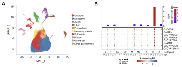 對測序獲得的單細胞數(shù)據(jù),結合細胞特異的標志基因,AddModuleScore?軟件和GO富集分析等方法,對水稻的細胞類型進行了分類注釋(圖2A)。基因表達分析發(fā)現(xiàn),維管細胞中的原形成層細胞在稻瘟菌侵染后高度誘導二萜類植保素合成代謝相關基因的表達,其中水稻關鍵植保素momilactone A合成被特異誘導(圖2B),促進了momilactone A在維管組織中積累,可能是抗稻瘟病的關鍵因素。相反,激素途徑和模式分子激發(fā)的免疫對抗病性貢獻較弱。