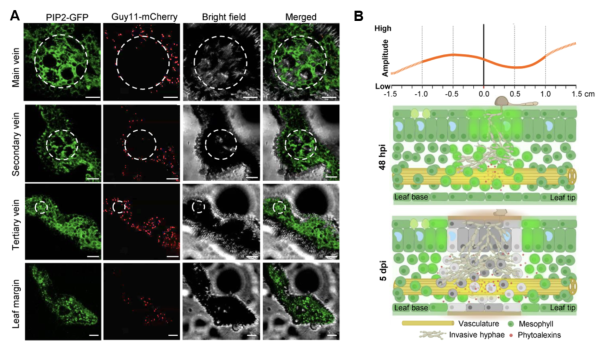 共聚焦顯微鏡觀察結果顯示,稻瘟菌孢子萌發(fā)后優(yōu)先靶向葉脈入侵,但是水稻的維管組織具有較強的免疫,稻瘟菌菌絲無法進一步侵入(圖3A)。時空組測序結果顯示,富含亮氨酸重復序列的(NLR)免疫基因的表達在接種24小時后,葉尖部較葉基部具有更強的積累,表明免疫基因的表達具有極性的特征。綜上所述,該項研究揭示了水稻在稻瘟病菌侵染時免疫基因存在細胞特異性和多維(局部和縱向)的表達模式,為挖掘新的免疫基因提供了重要的數(shù)據(jù)基礎(圖3B)。