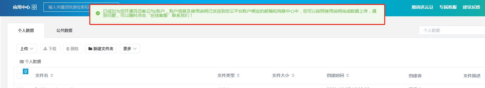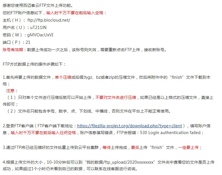 FTP 上傳:數(shù)據(jù)量大于 200M 時使用 FTP 上傳數(shù)據(jù)。選擇“FTP 上傳”后彈出提示對話框,點擊“確定”后系統(tǒng)會自動創(chuàng)建一次性的 FTP 賬戶,用于本次數(shù)據(jù)上傳。賬戶信息會發(fā)送至注冊郵箱及平臺的“個人中心——消息中心”中。依照提示操作即可。