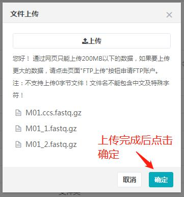 上傳文件:選 擇 文 件 上 傳 , 點 擊 “ 上 傳 ” , 選 擇 下 載 好 的 原 始 數(shù) 據(jù)(\Needed_Data\Rawdata\01.Rawdata 路徑下的所有文件),點擊確定即可等待數(shù)據(jù)上傳完成。