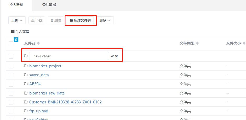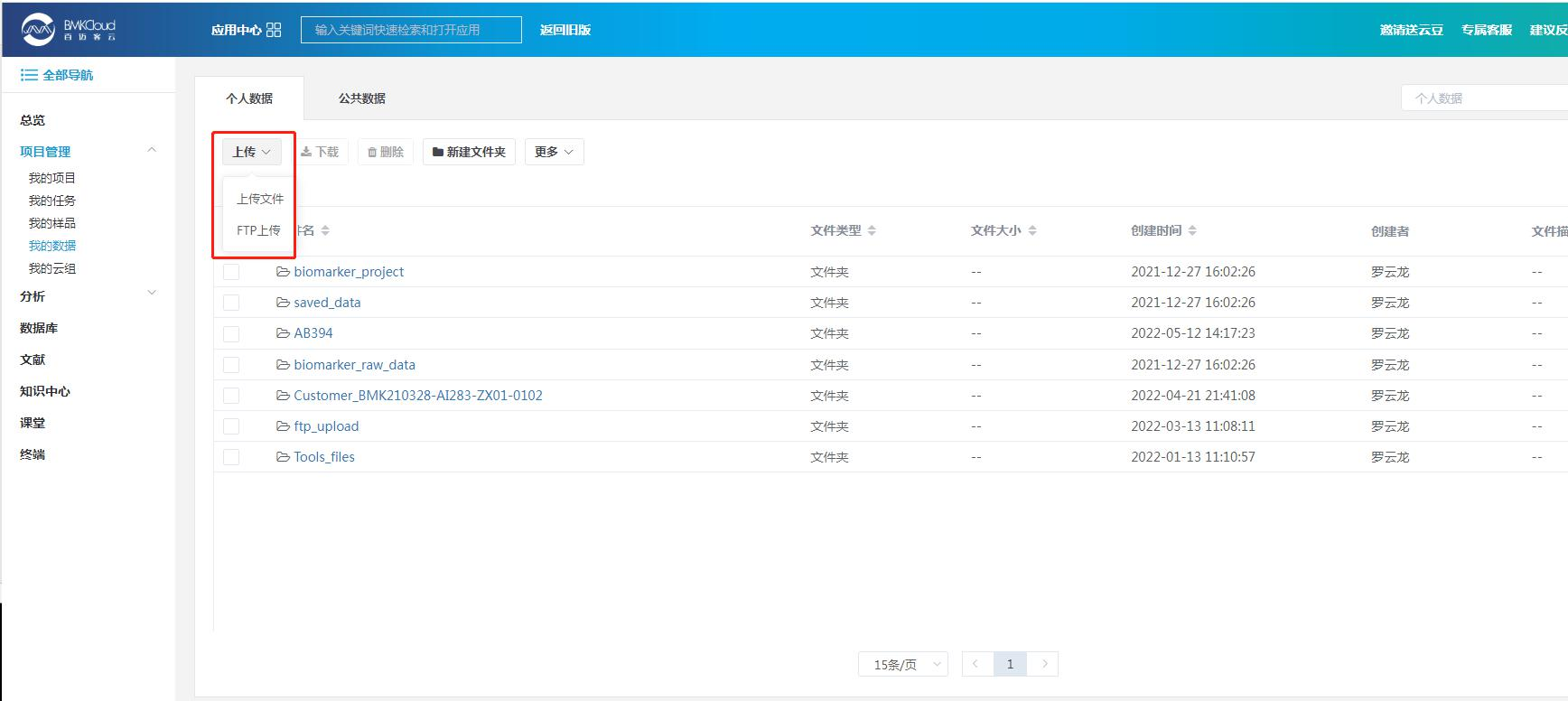2、在我的數(shù)據(jù)中,建議新建文件夾后,進(jìn)入新文件夾,點擊“上傳”,選擇上傳文件或 FTP 上傳。