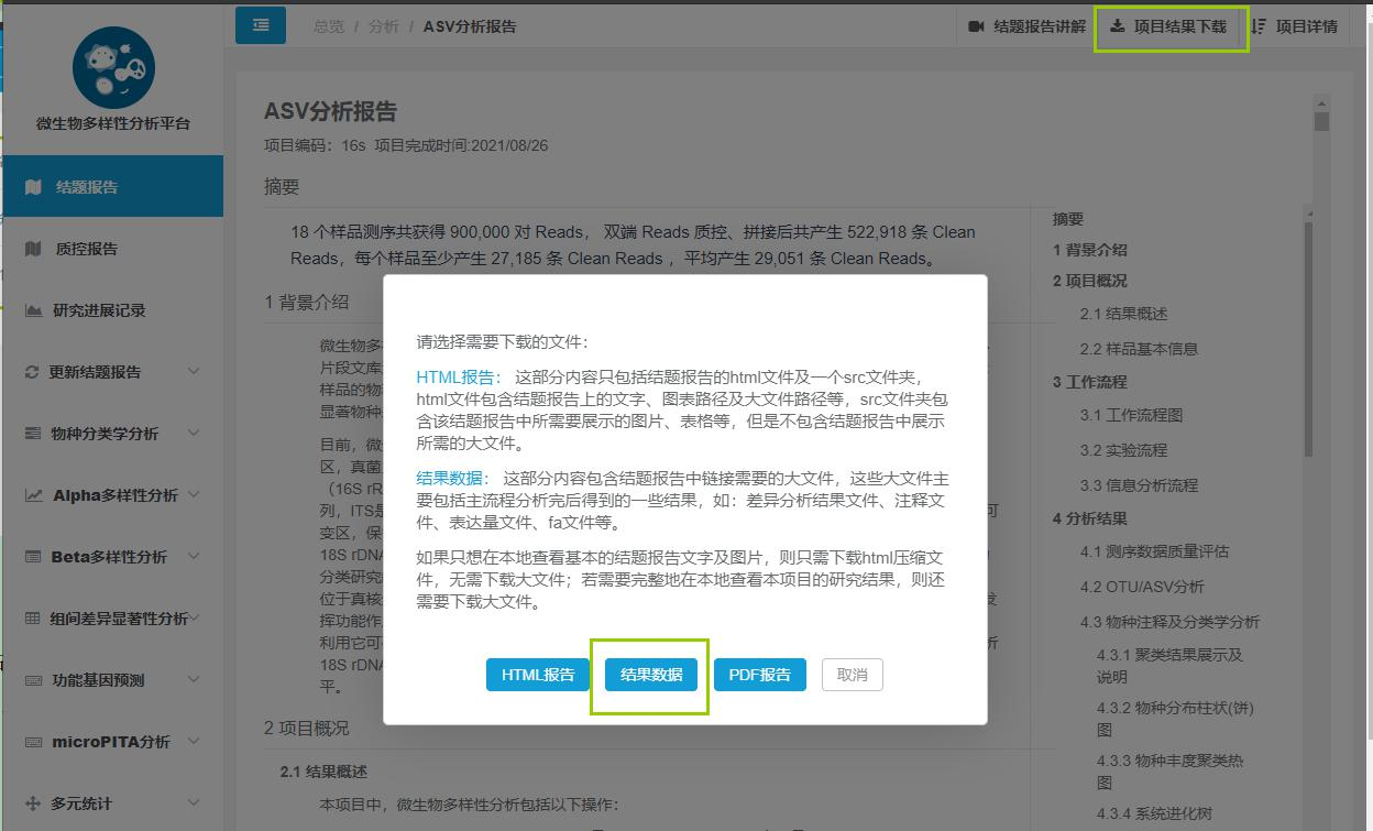 上述報告查找頁面 – 打開報告之后 – 點擊報告右上角 – 項目結(jié)果下載 – 選擇下載結(jié)果數(shù)據(jù)